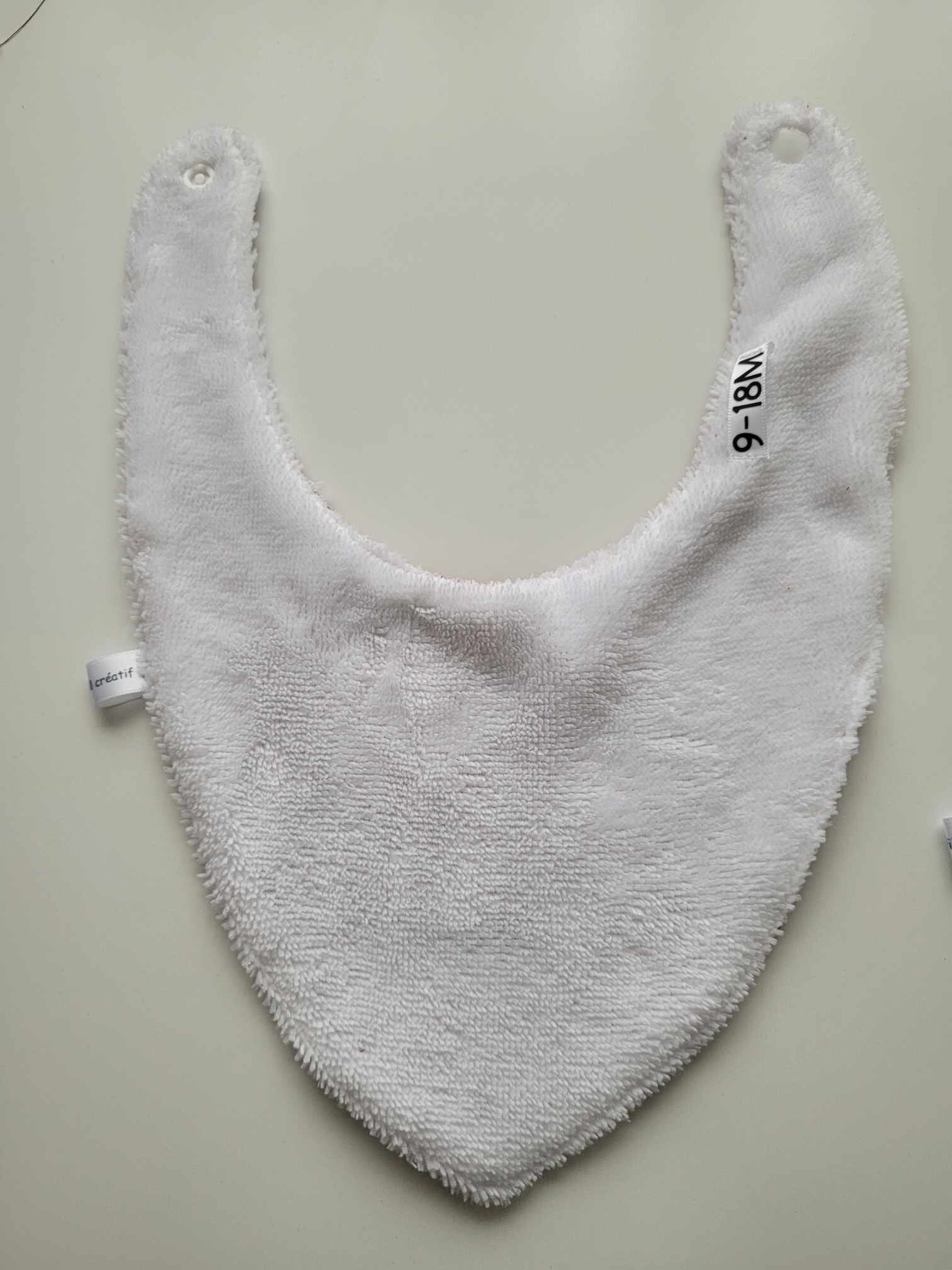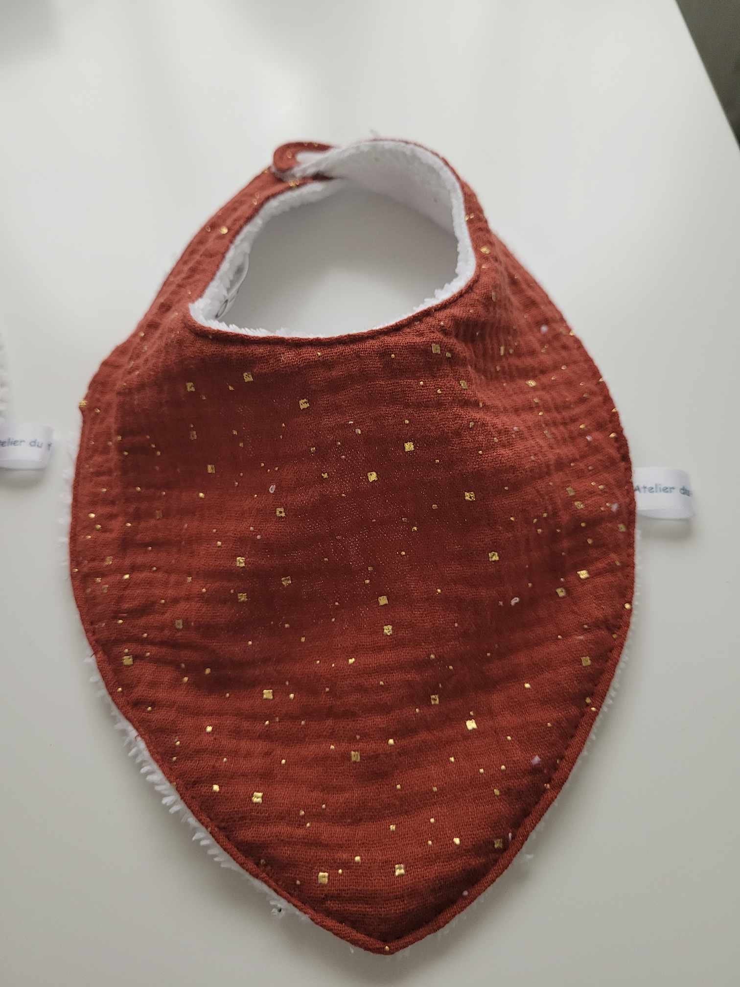 Bavoir bandana en tissu double gaze rouge orangé et or et tissu éponge bambou.