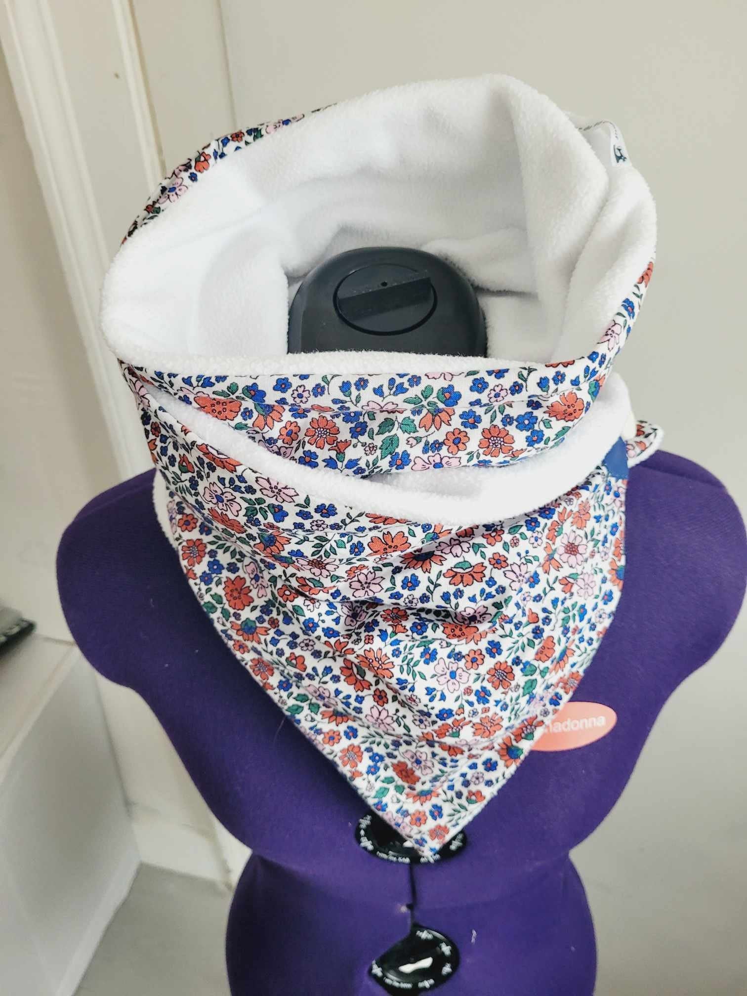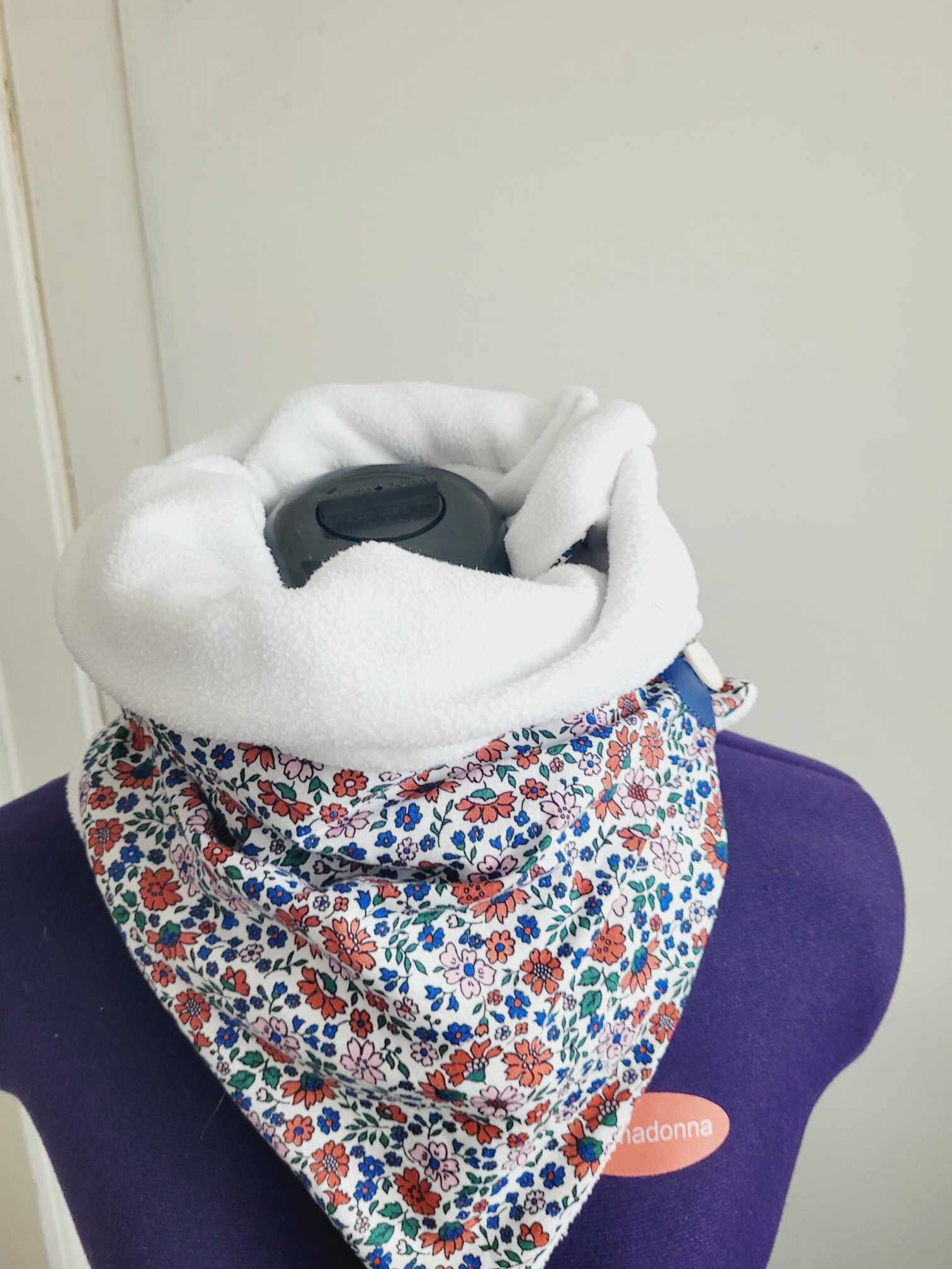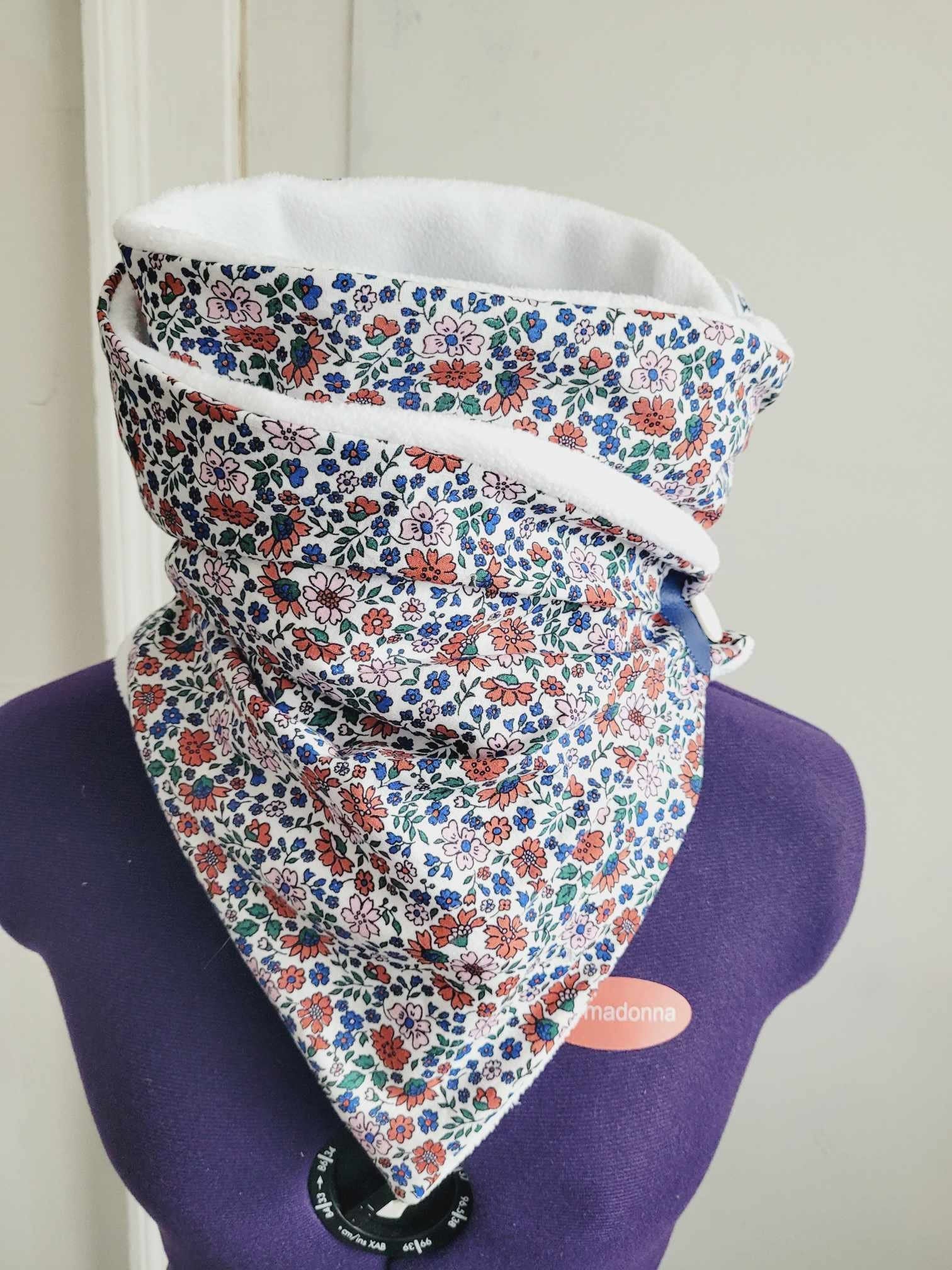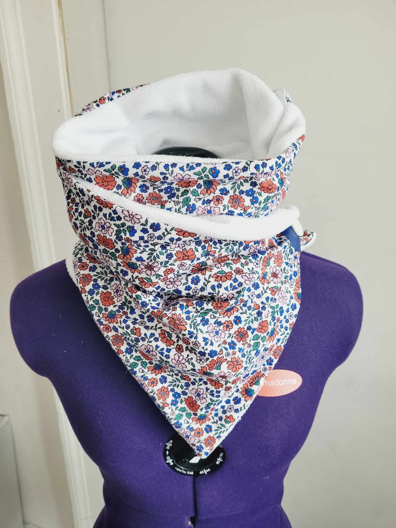 Cette écharpe, chèche, étole est en tissu coton fleuri et tissu polaire pour qu'elle tient chaud.