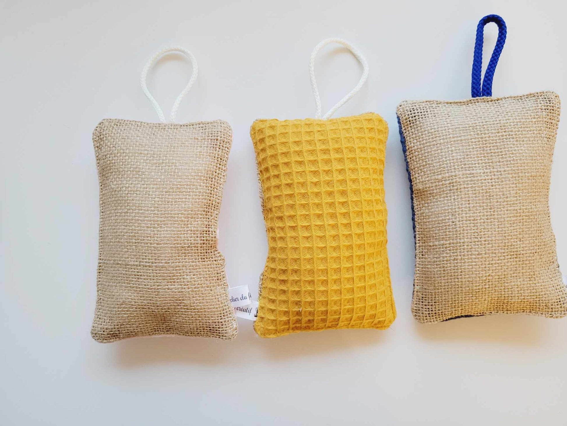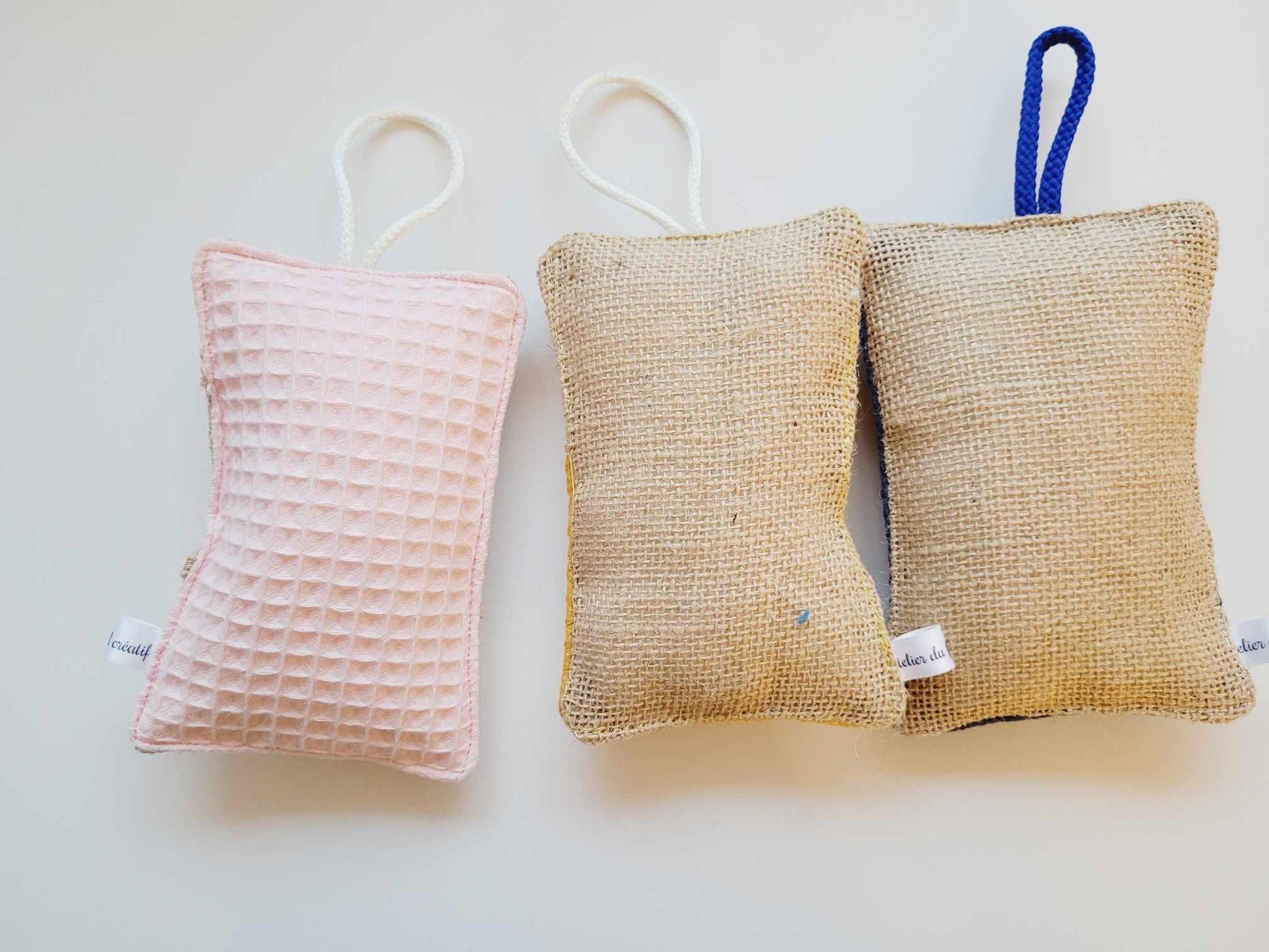 Eponges lavable et écologique, sont réalisées en tissu coton et en toile de jute ou pour certains modèles et l'autre face avec du tissu nid d'abeille Elles sont rembourré de mousse.