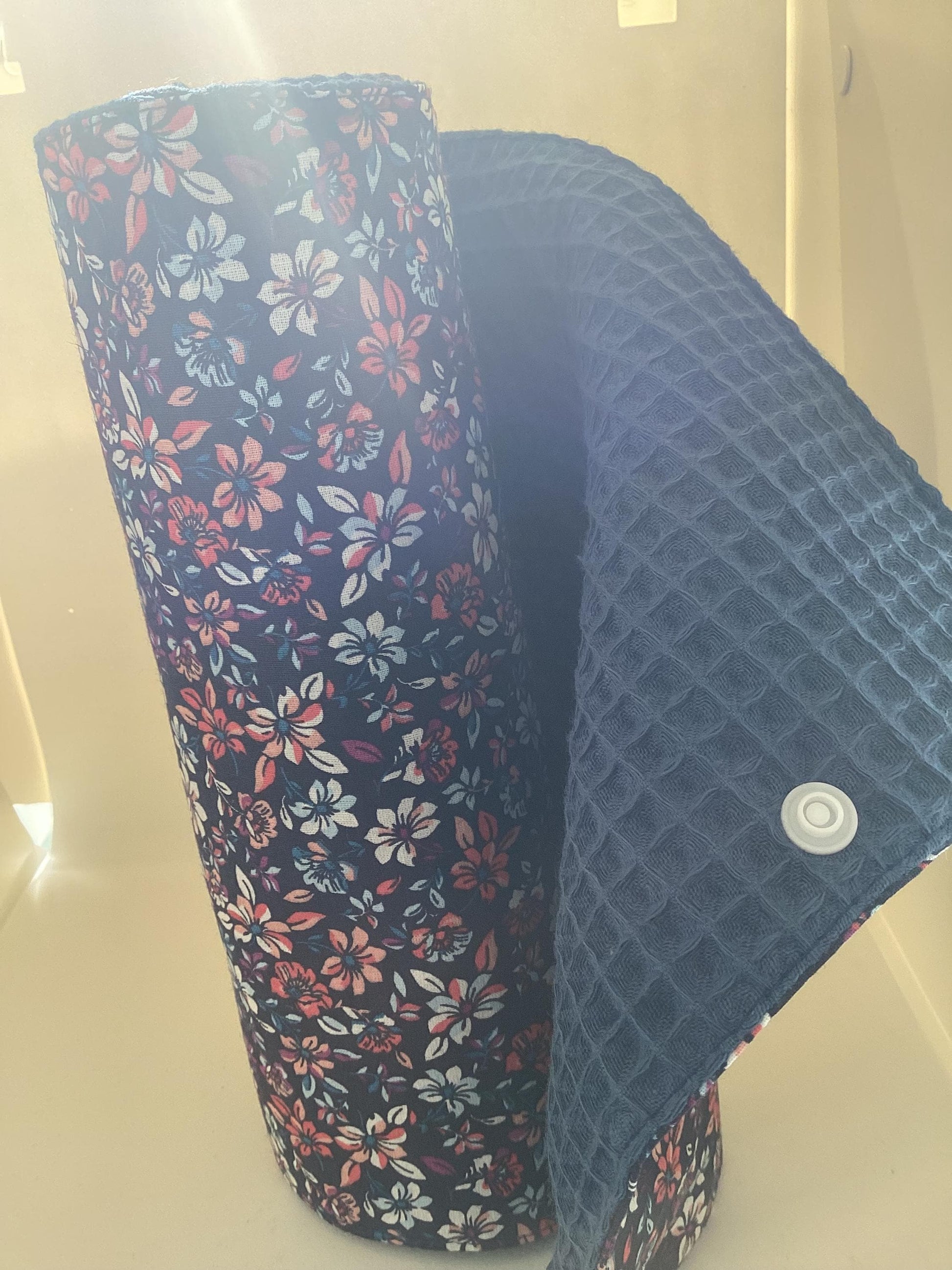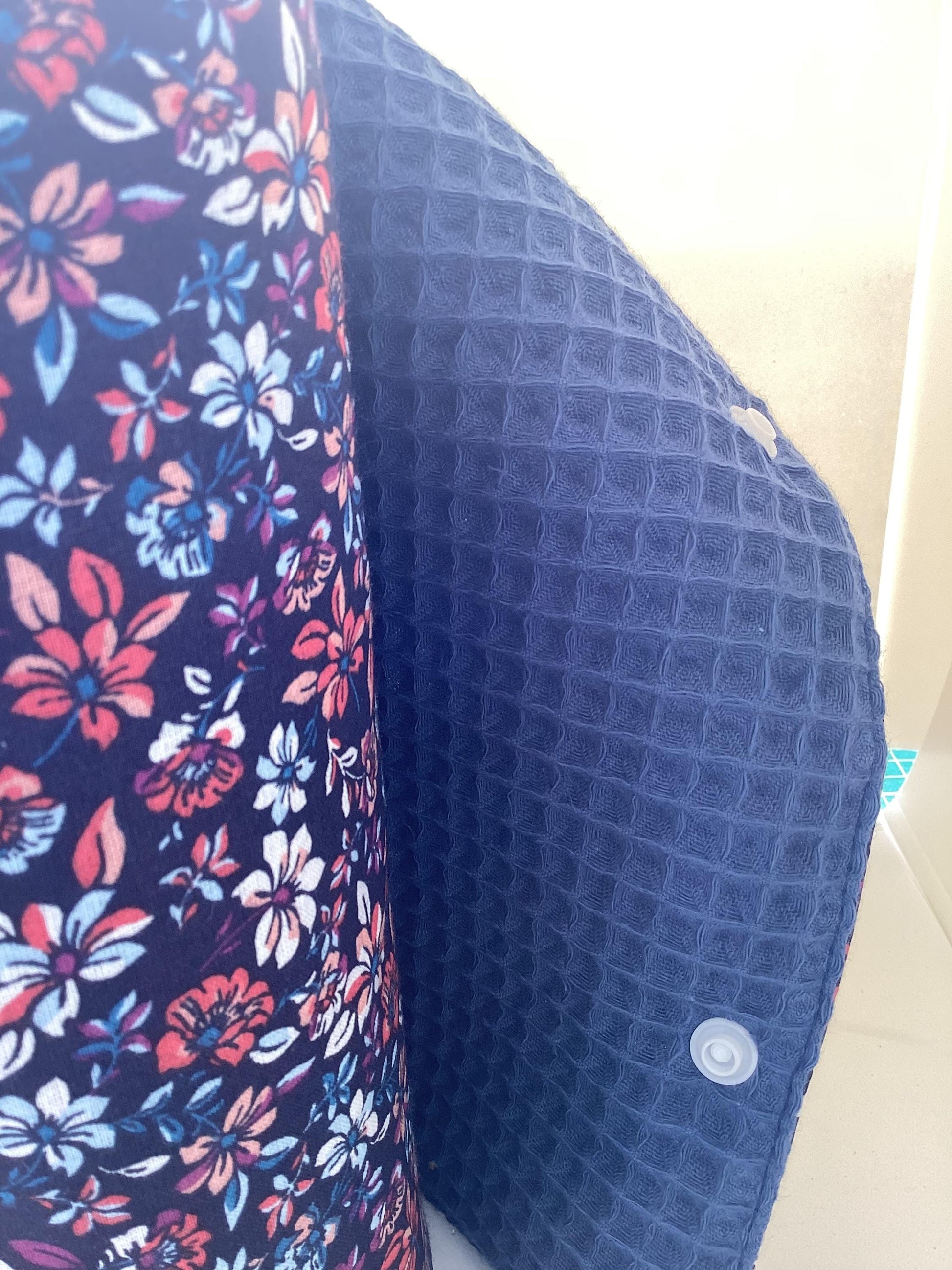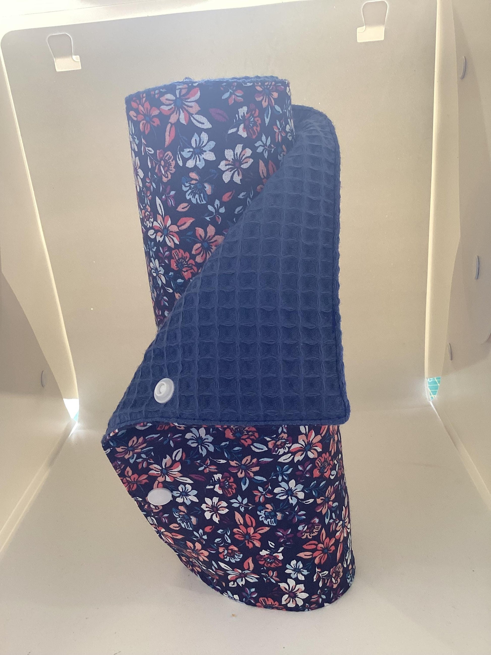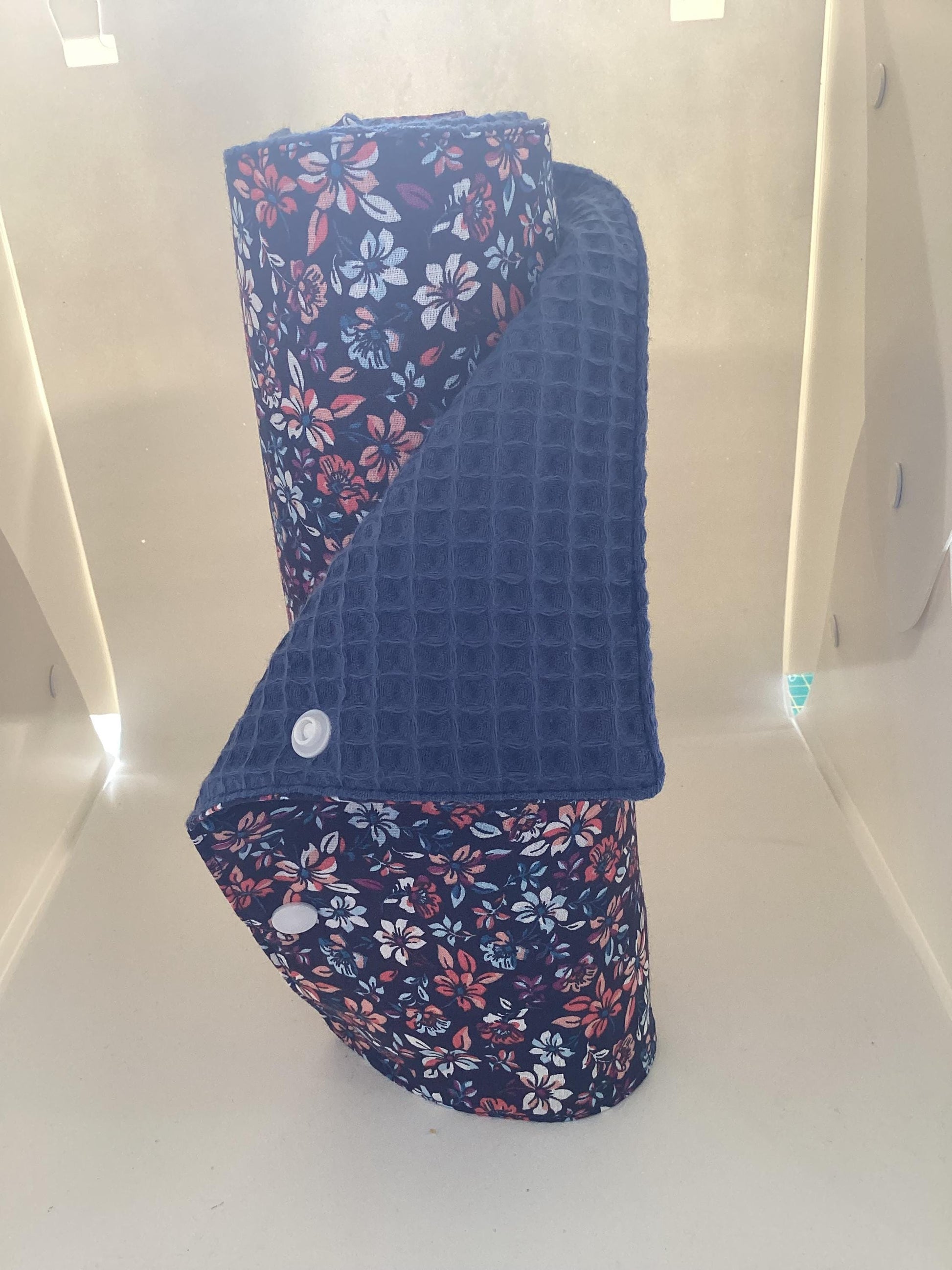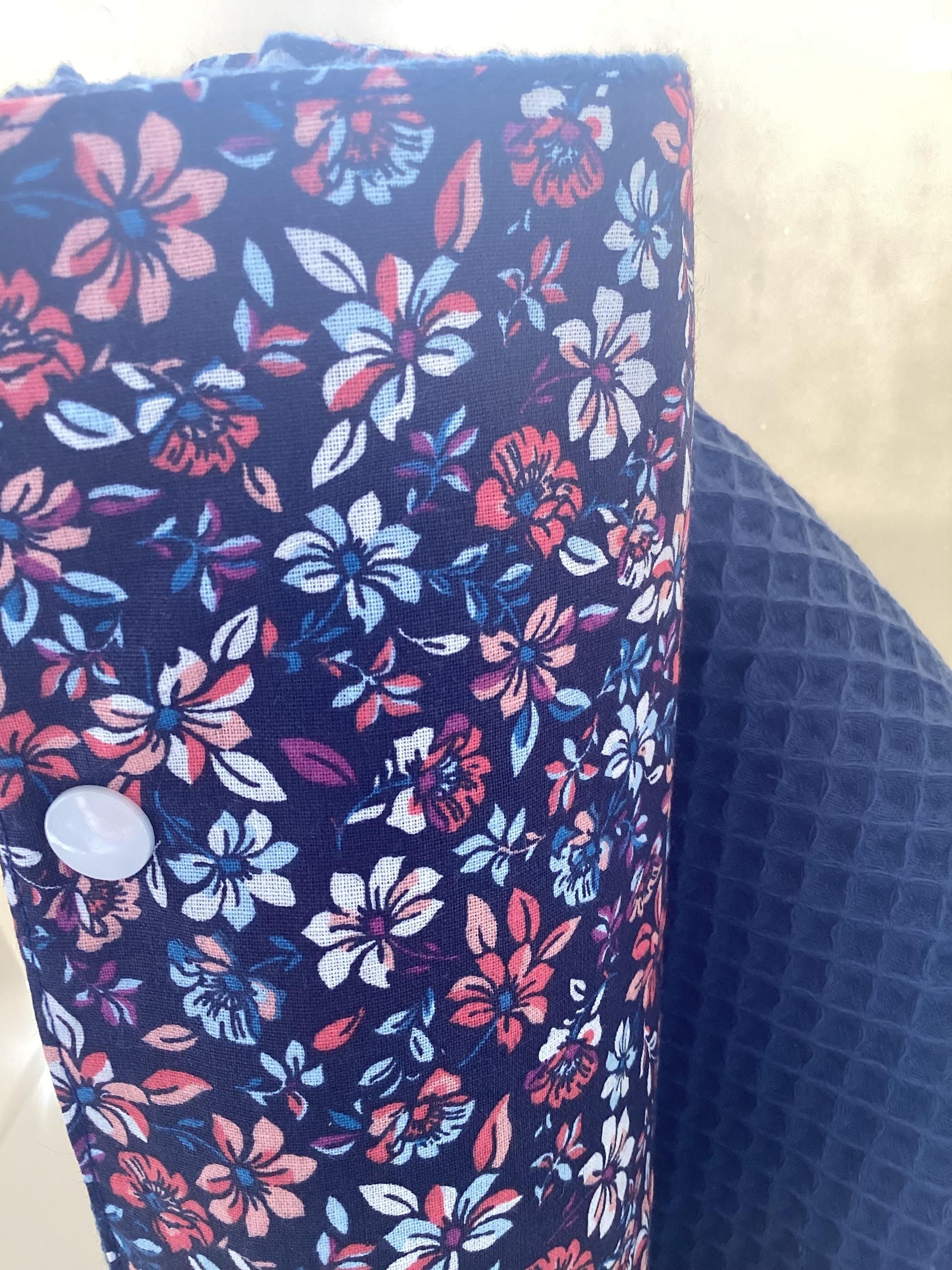 Les feuilles d'essuie-tout lavable sont réalisé d'une face extérieur d'un tissu fleuri et d'une face intérieur avec un tissu nid d'abeille bleu marine.