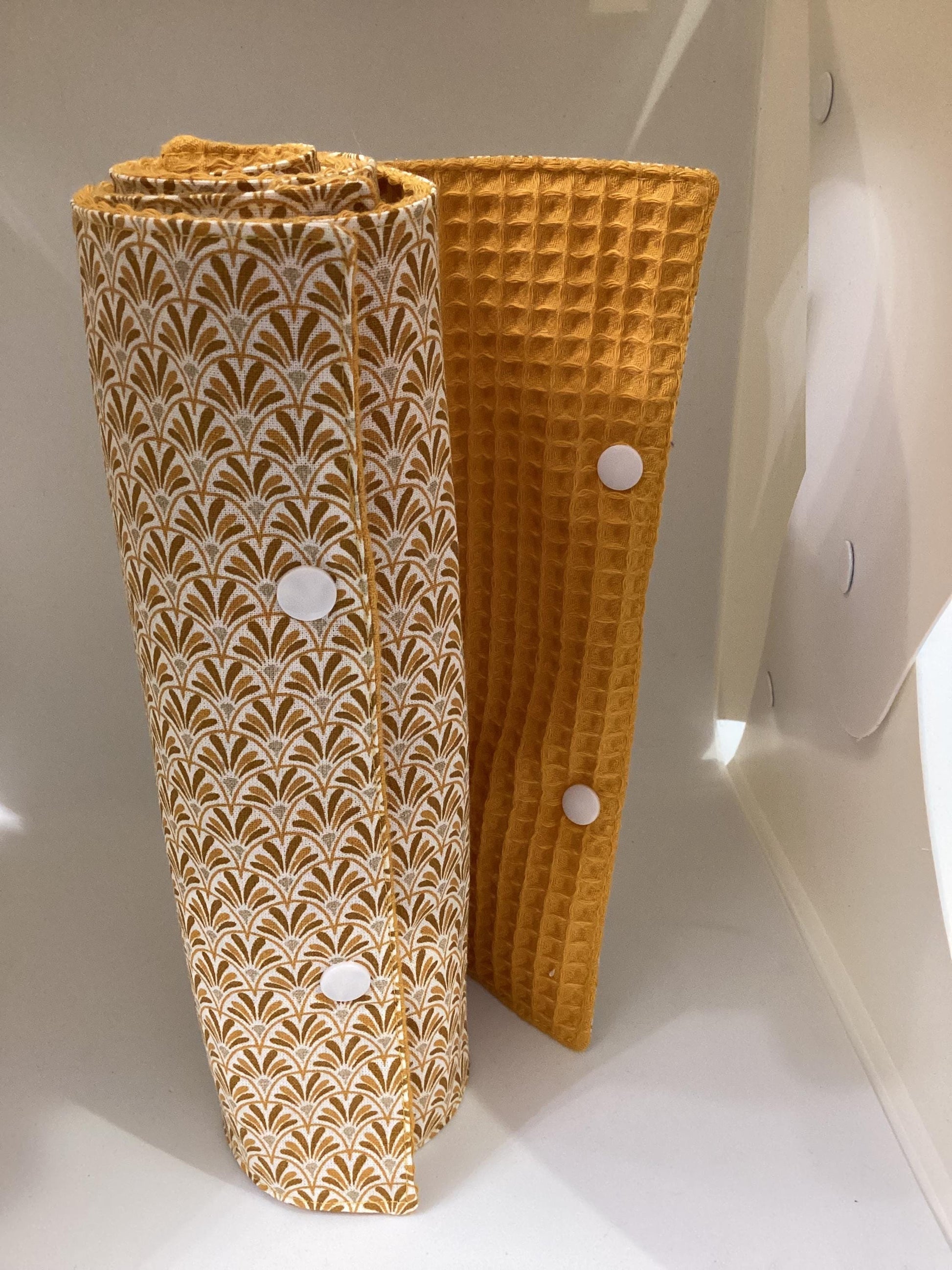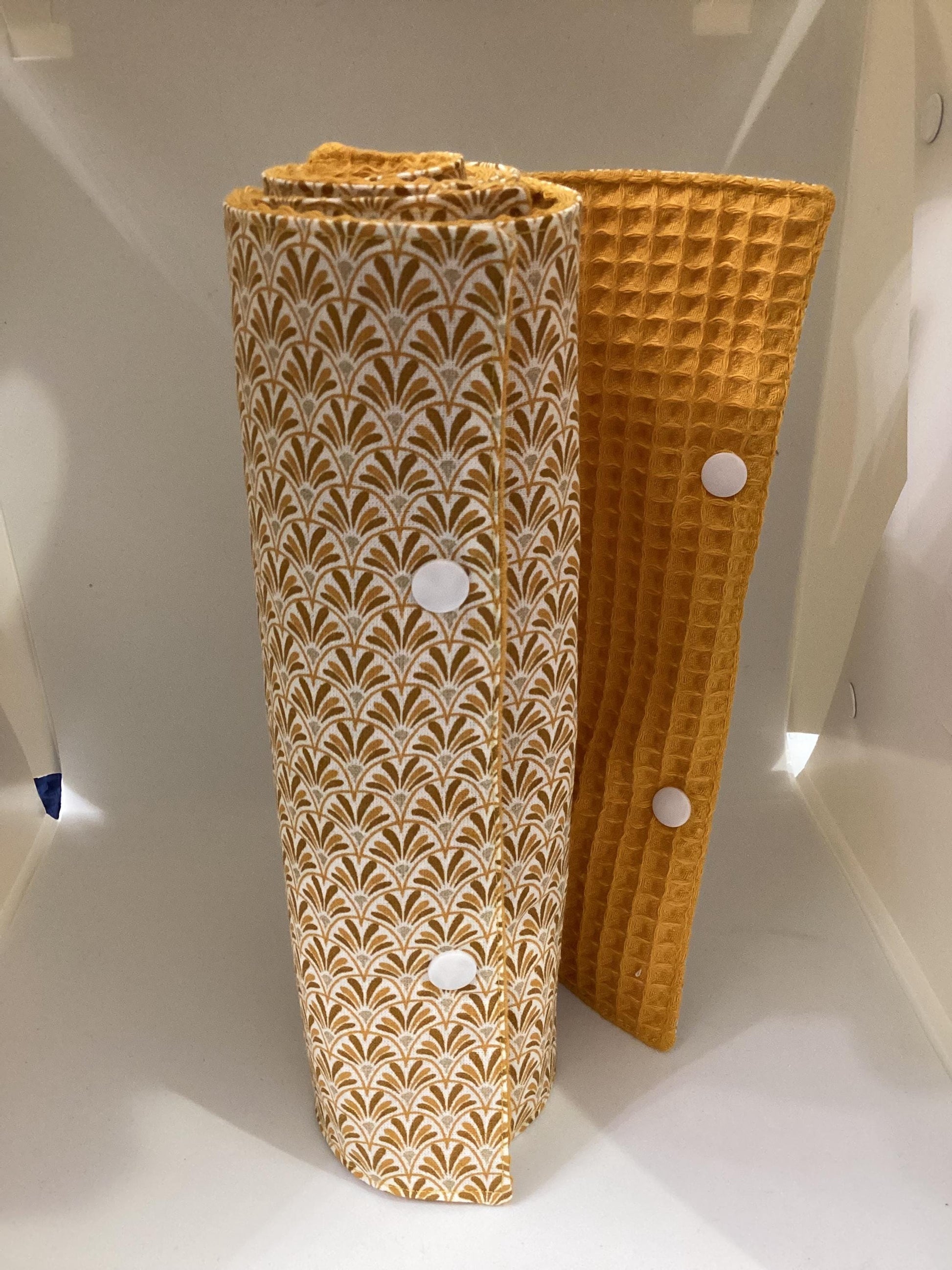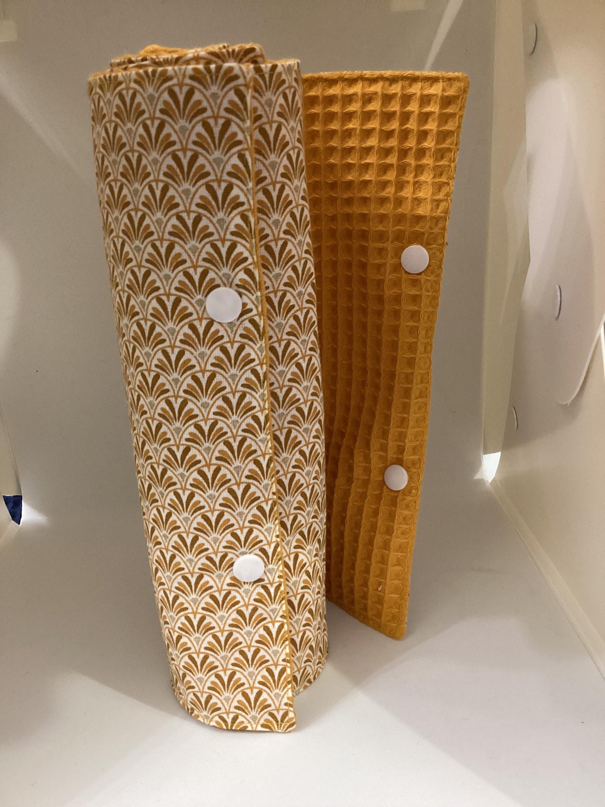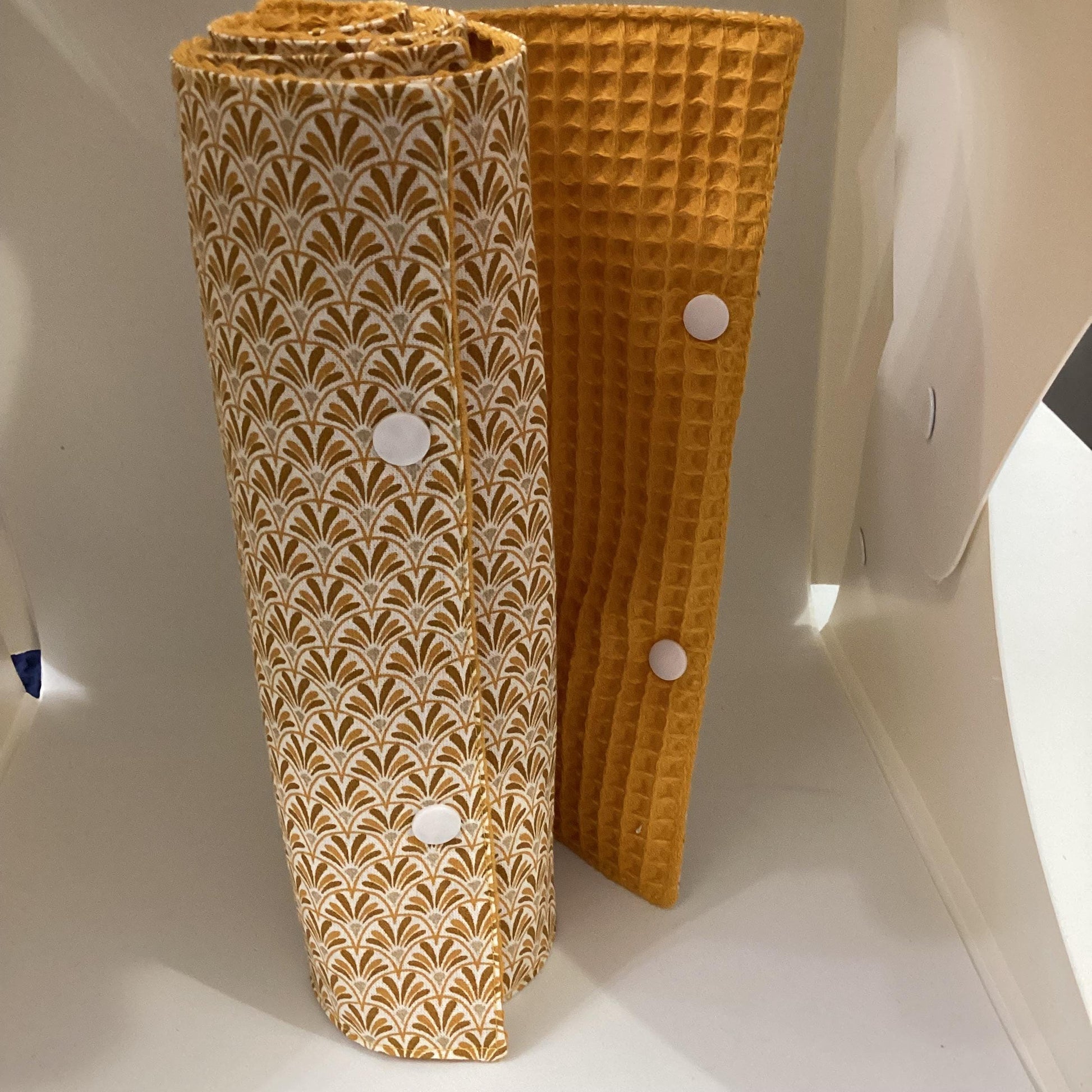 Les feuilles d'essuie-tout lavable sont réalisé d'une face extérieur d'un tissu et d'une face intérieur avec un tissu nid d'abeille moutarde.