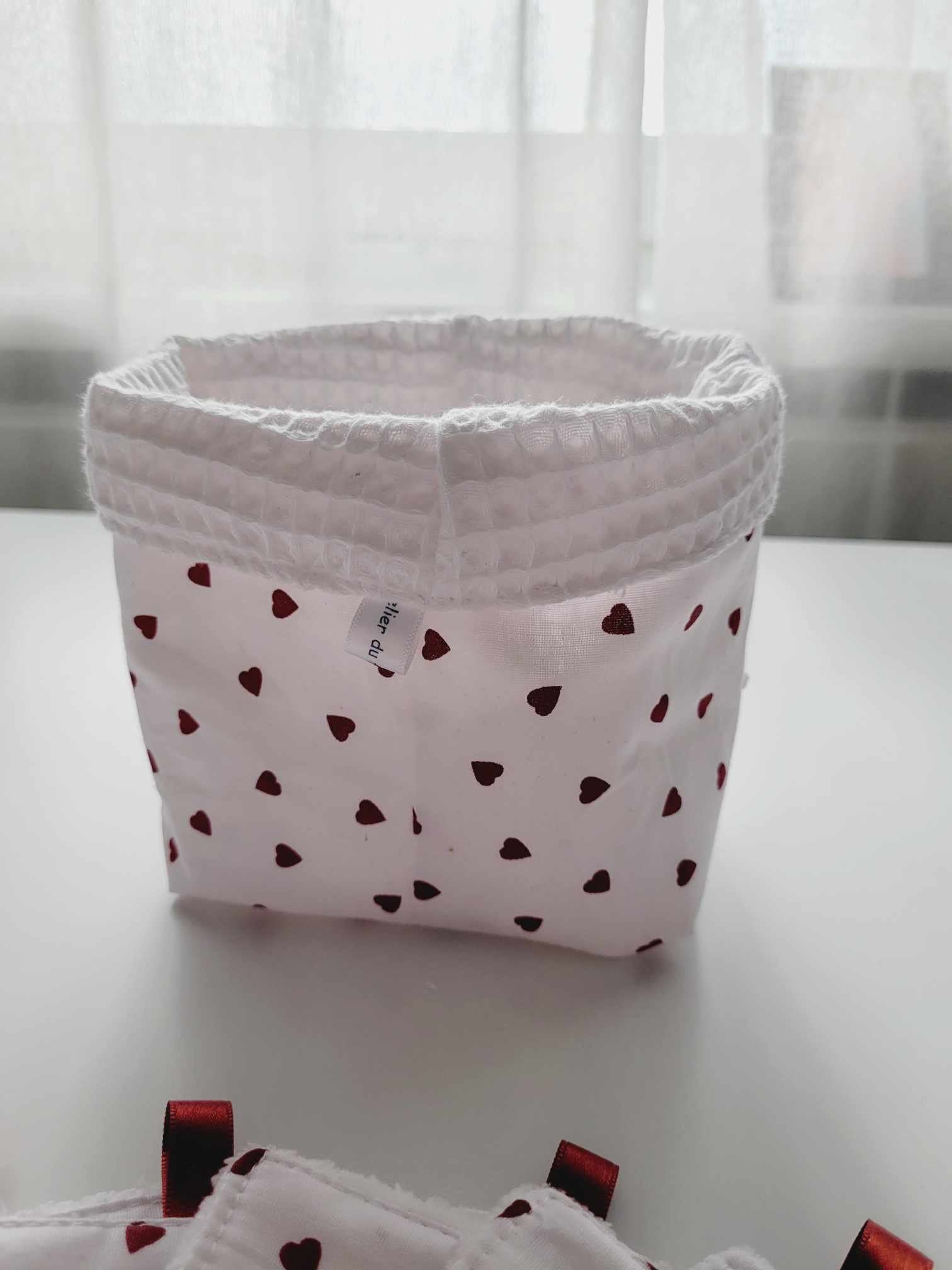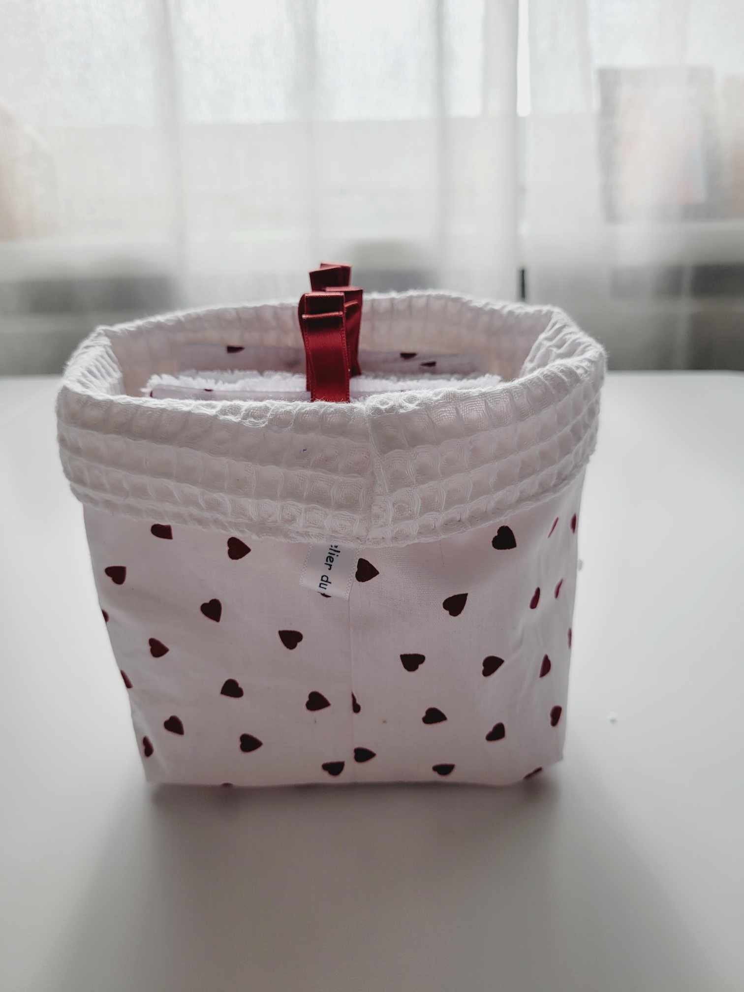 Le panier est réalisé, d'un tissu extérieur en coton coeur et d'un tissu intérieur en nid d'abeille.