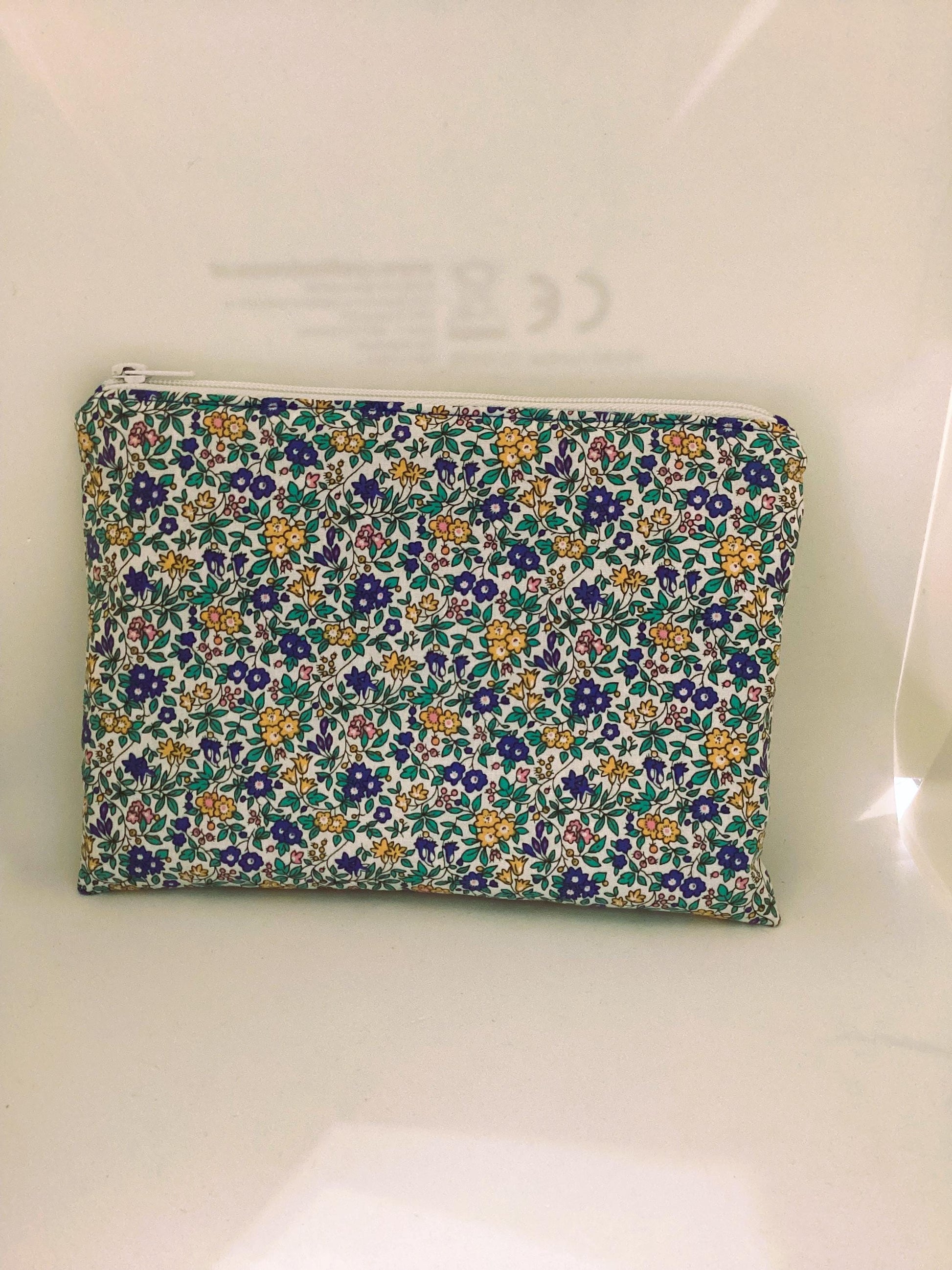 DESCRIPTION : La pochette est décrite par un tissu extérieur en coton bio fleuri, et un tissu intérieur violet.