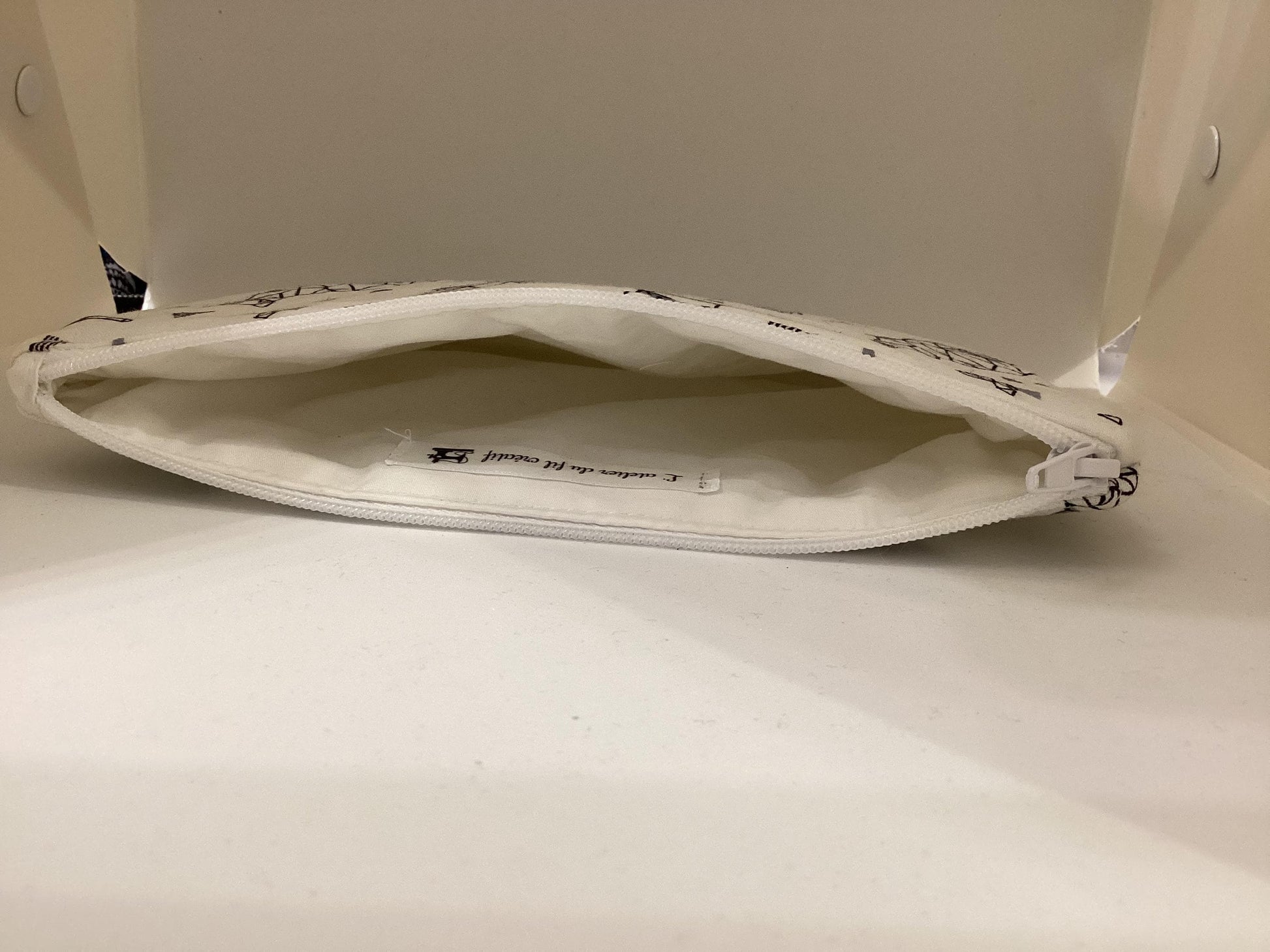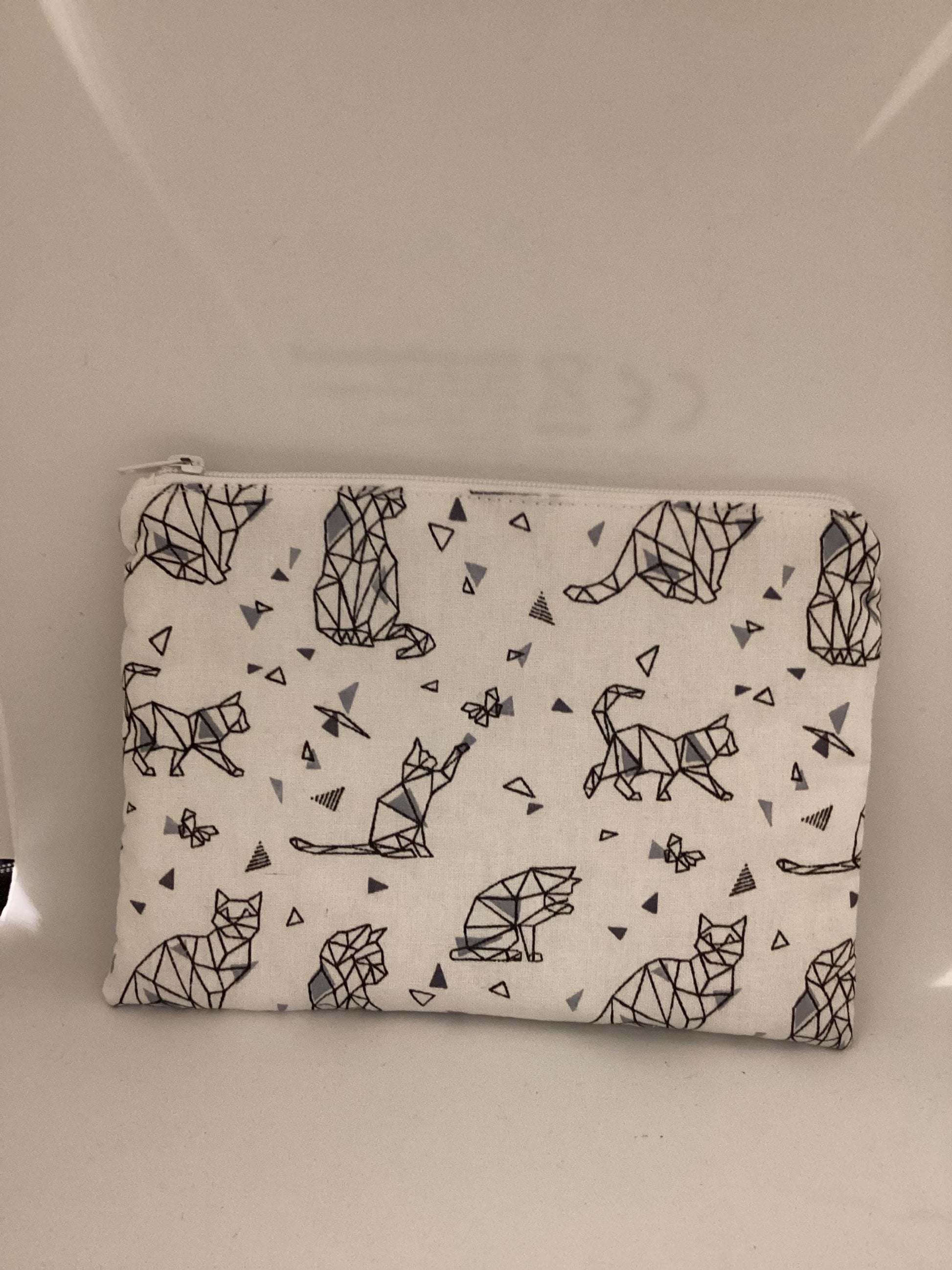 DESCRIPTION : La pochette est décrite par un tissu extérieur en coton bio Chat, et un tissu intérieur Blanc.