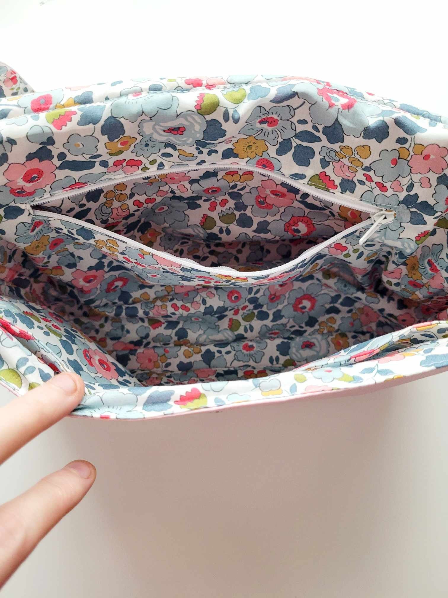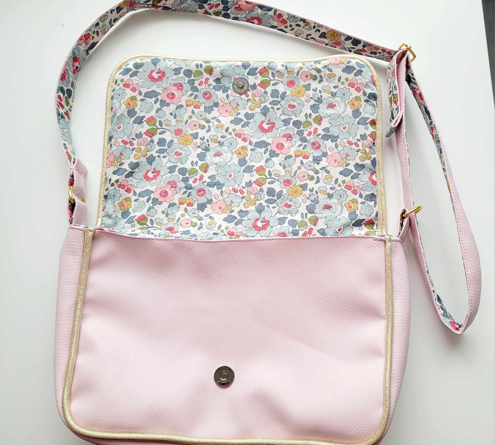 sac dans un simili cuir rose et un tissu liberty.