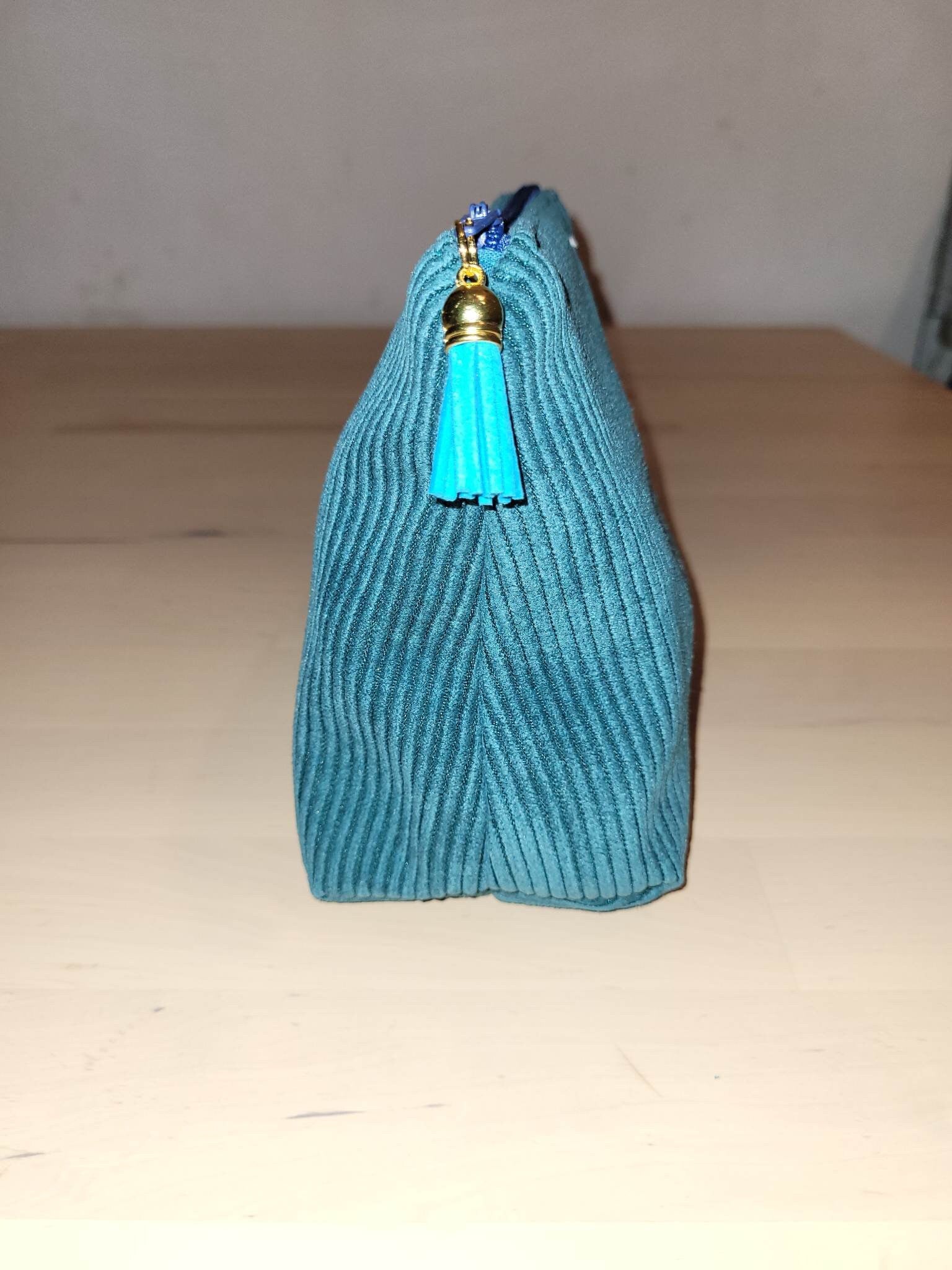 Trousse maquillage en velours côtelé bleu canard et doublé avec un tissu coton..