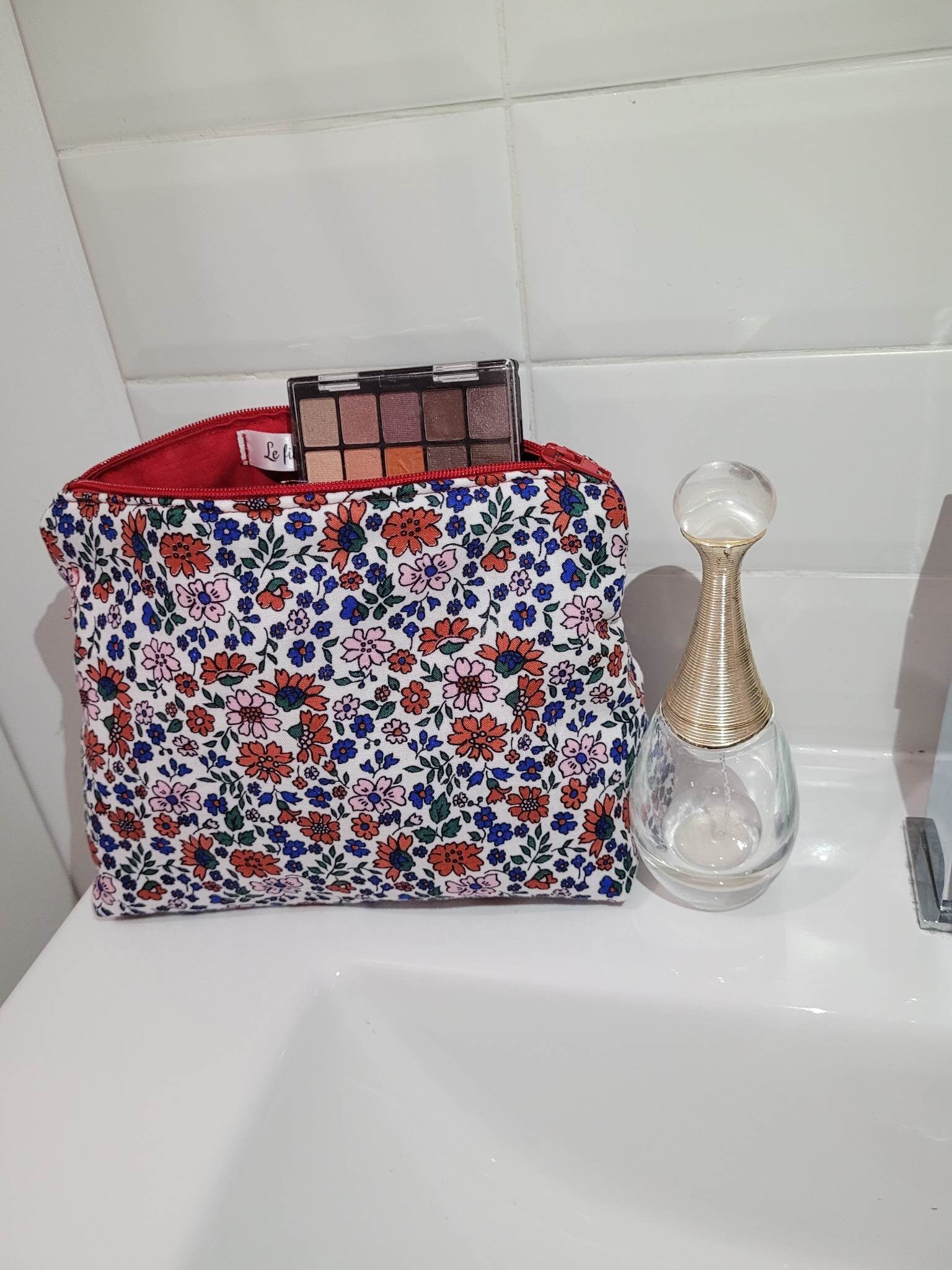 Trousse de maquillage en tissu liberty et doublé avec un tissu coton.
