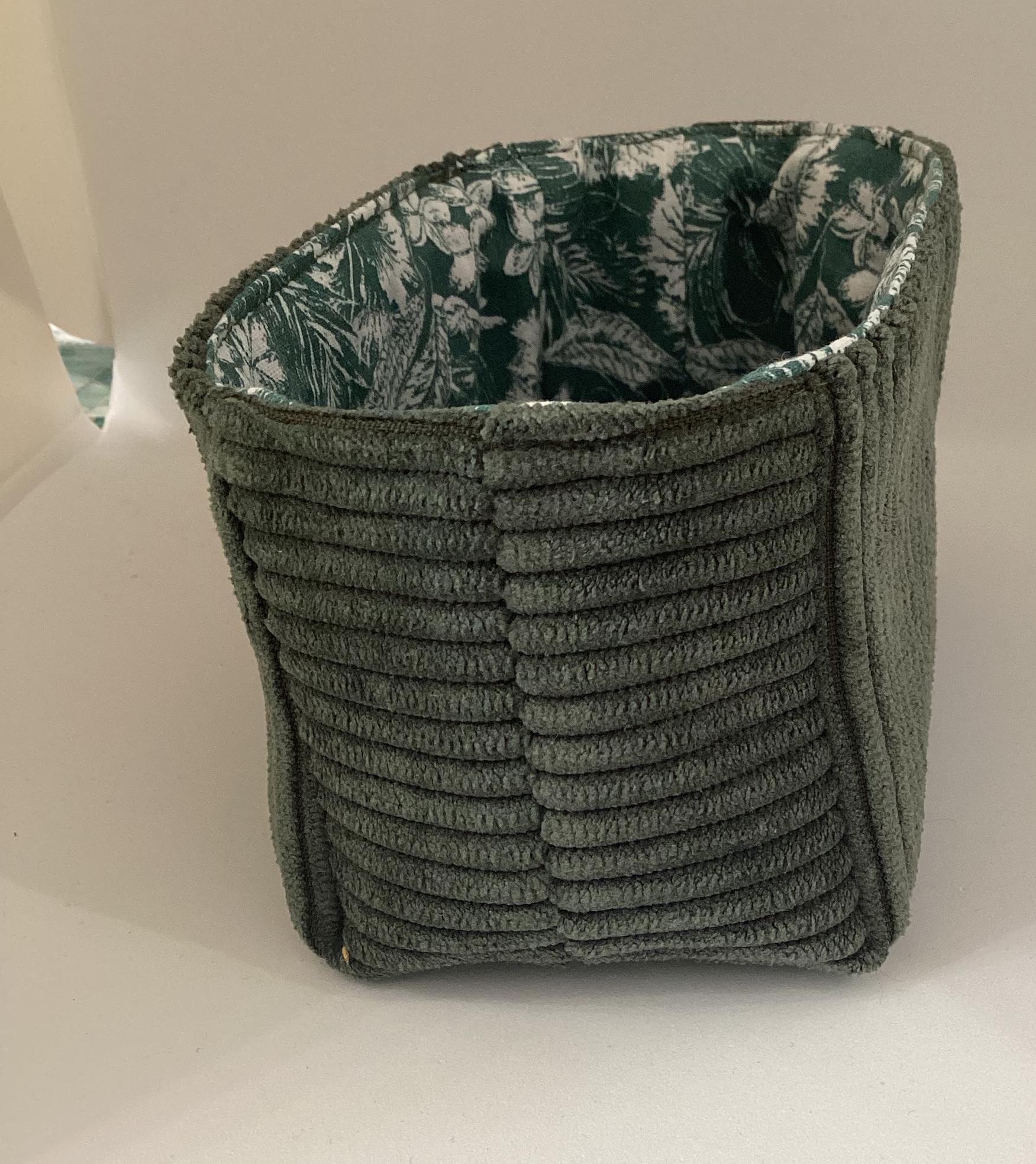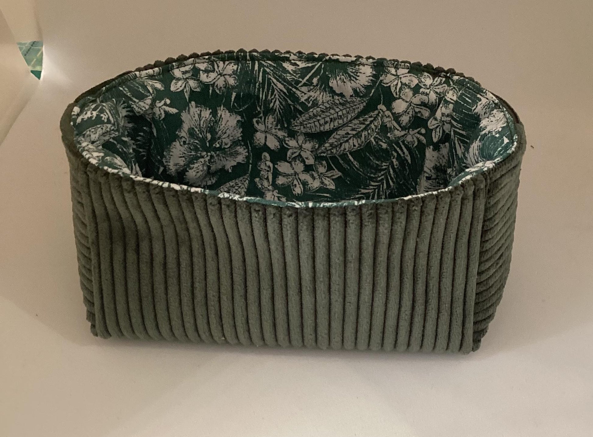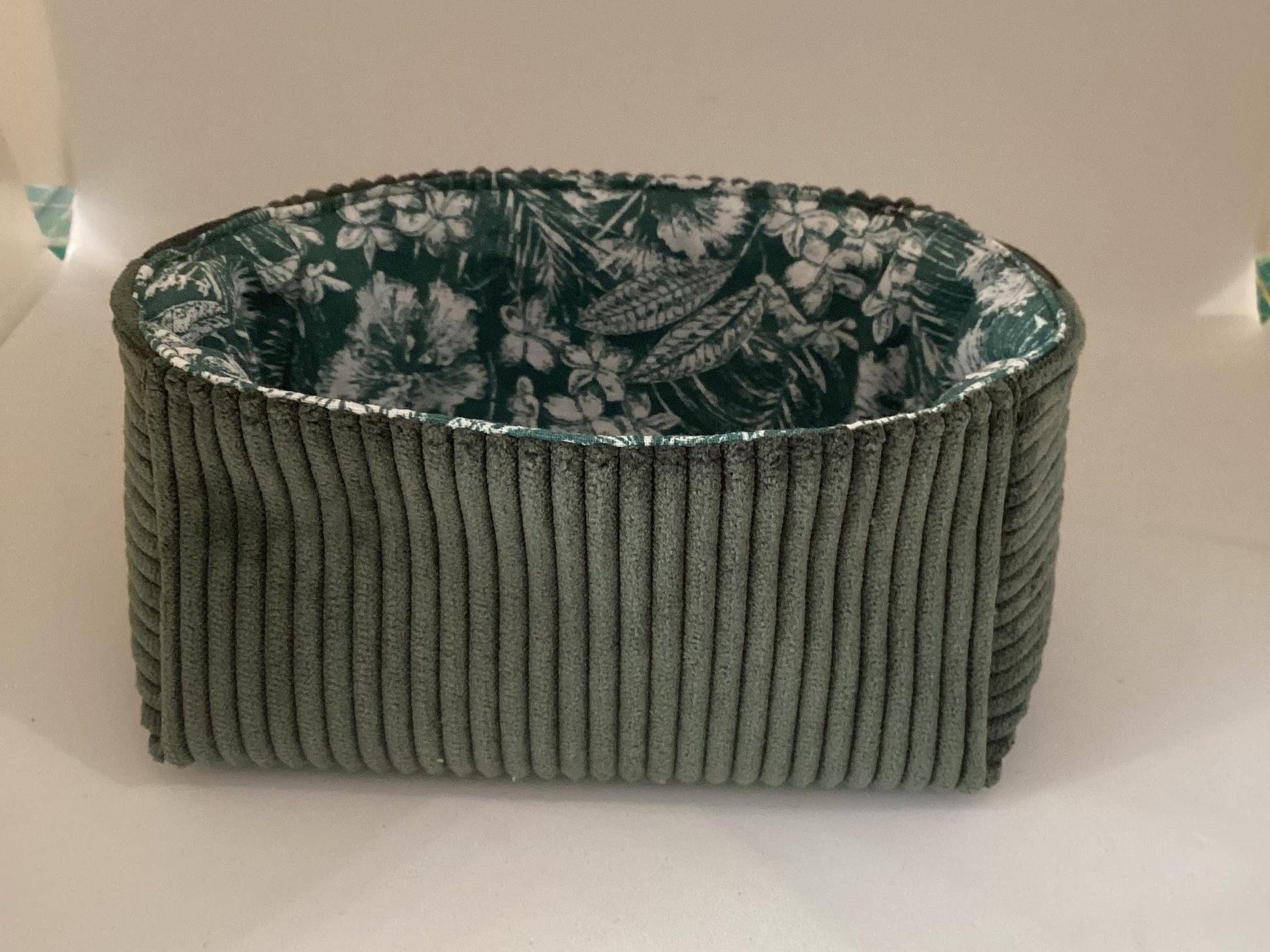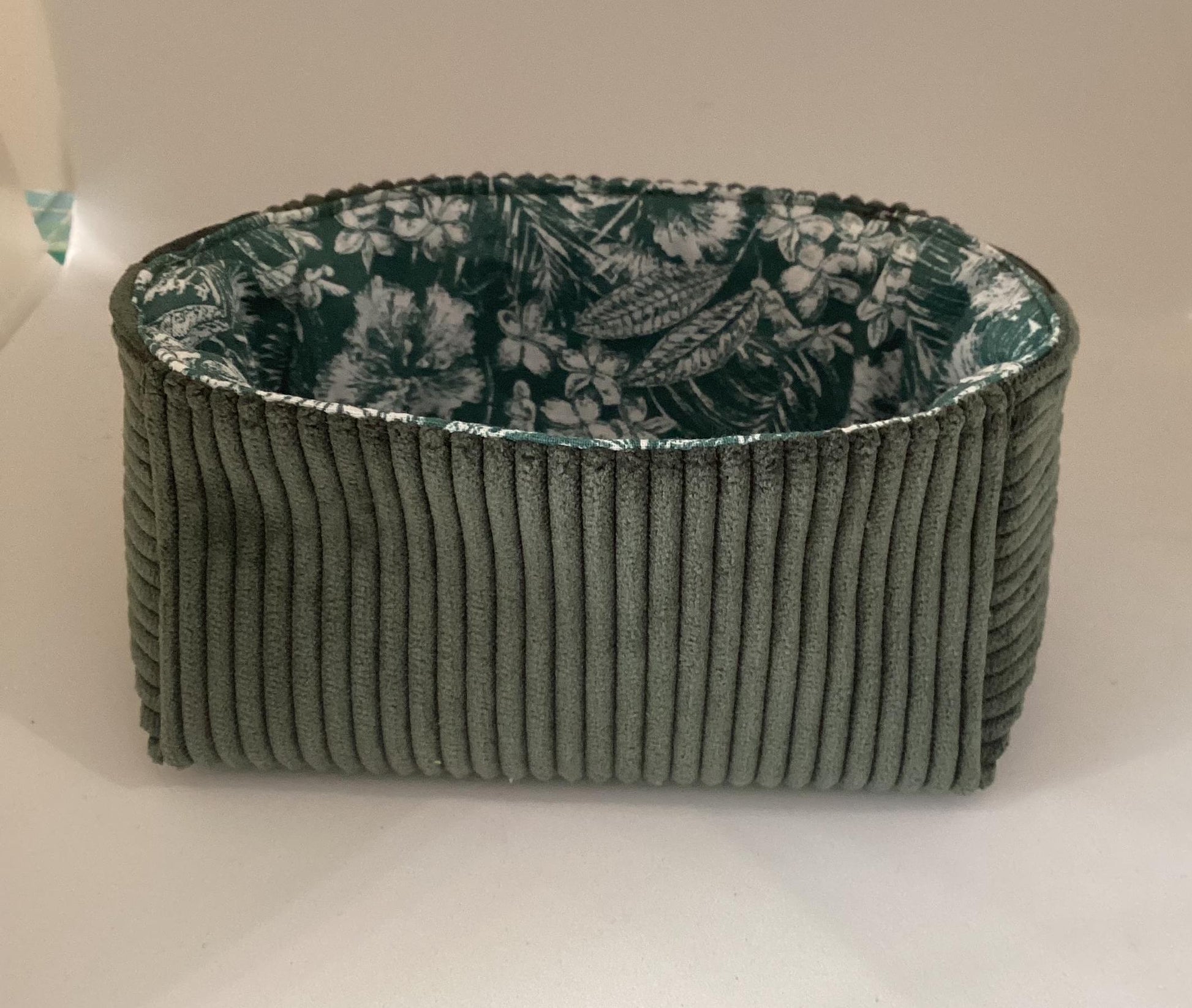 Ce vide poche est réalisé en velours côtelé vert bouteille et tissu fleuri à l'intérieur.