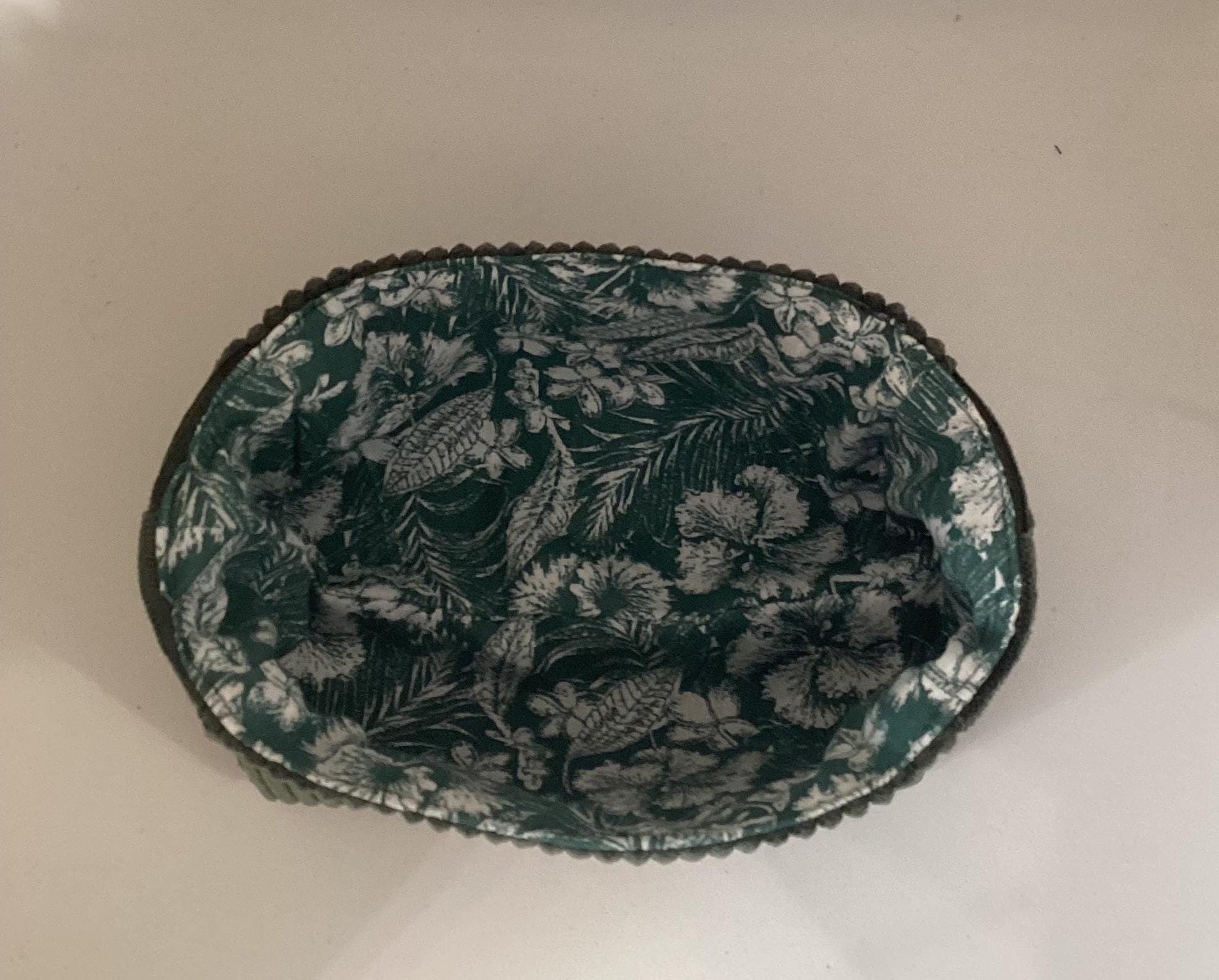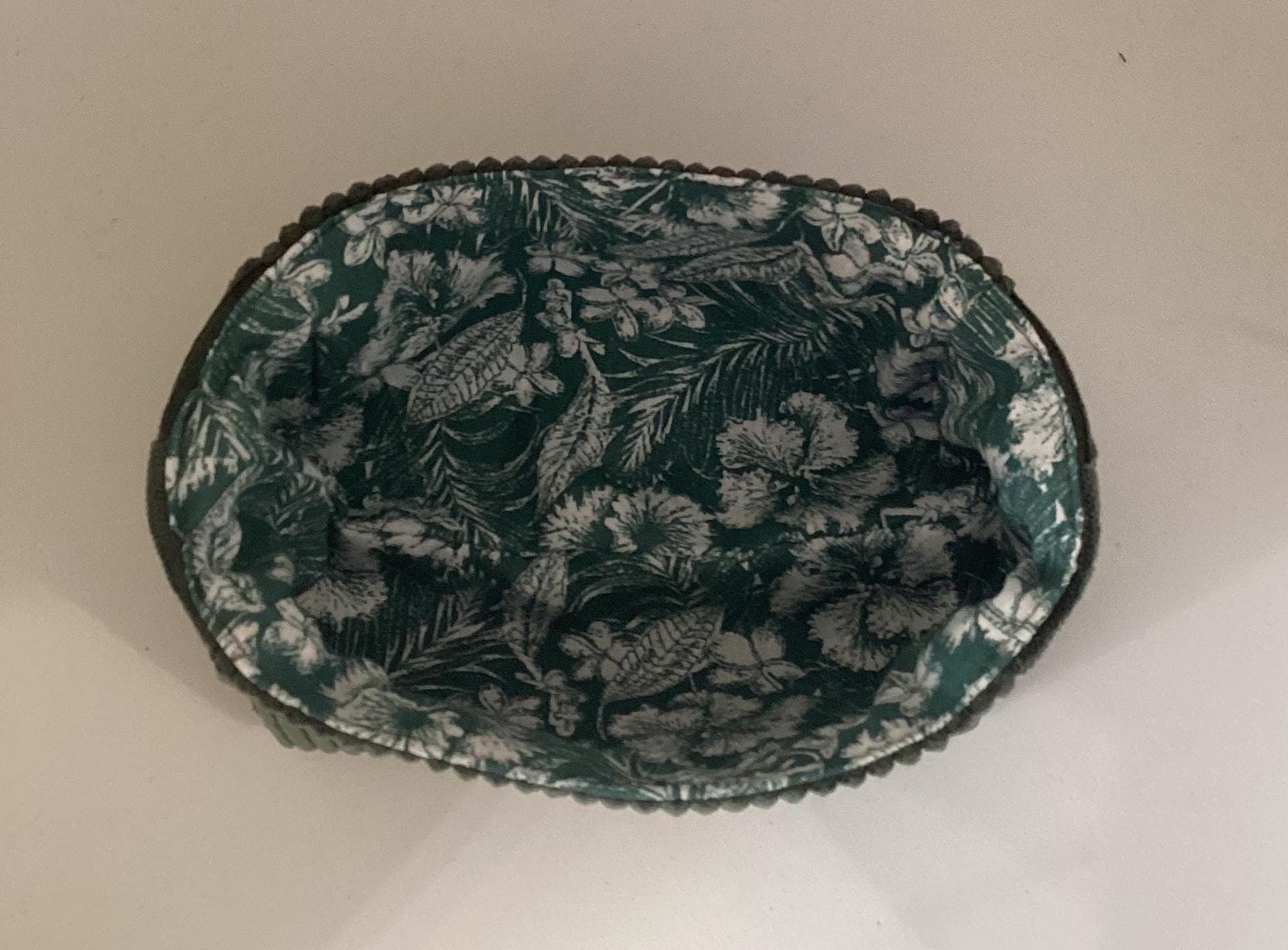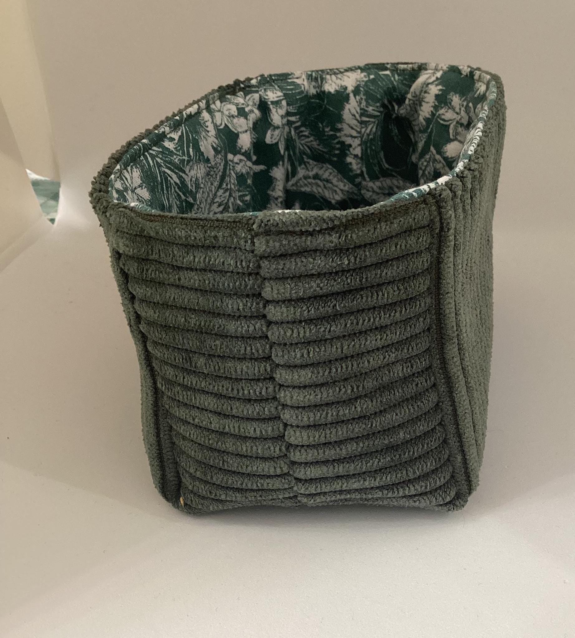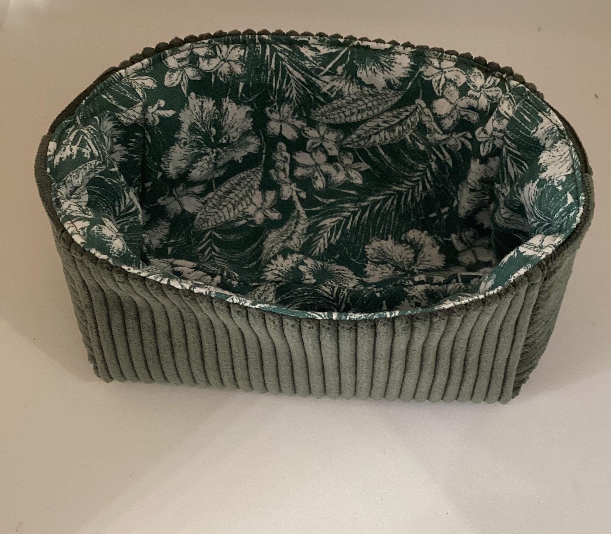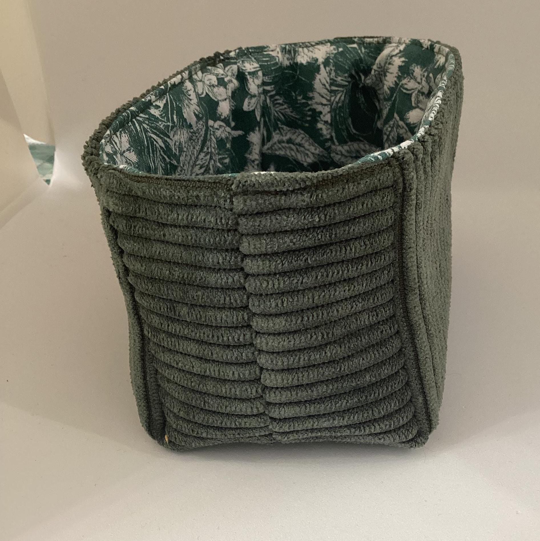 Ce vide poche est réalisé en velours côtelé vert bouteille et tissu fleuri à l'intérieur.
