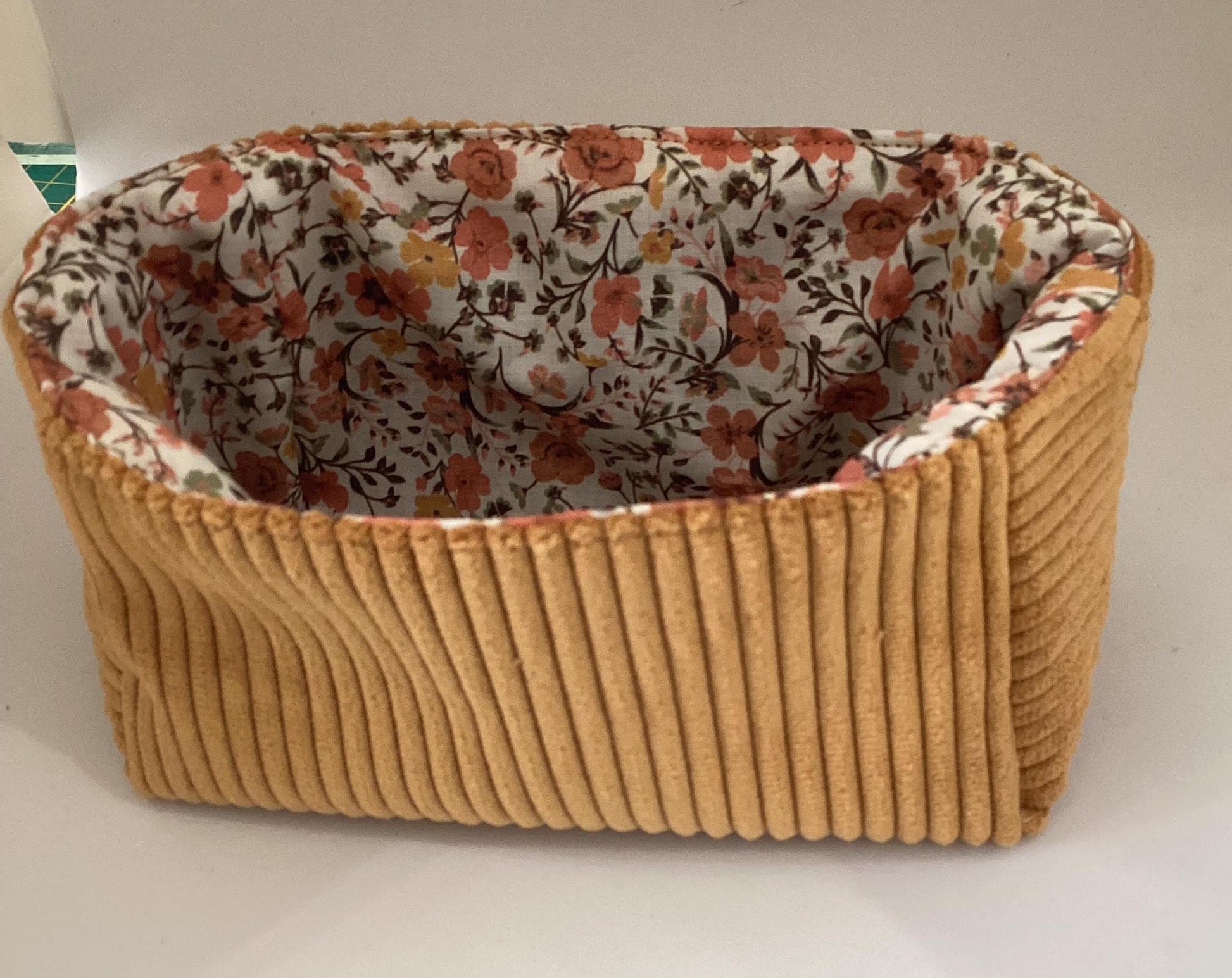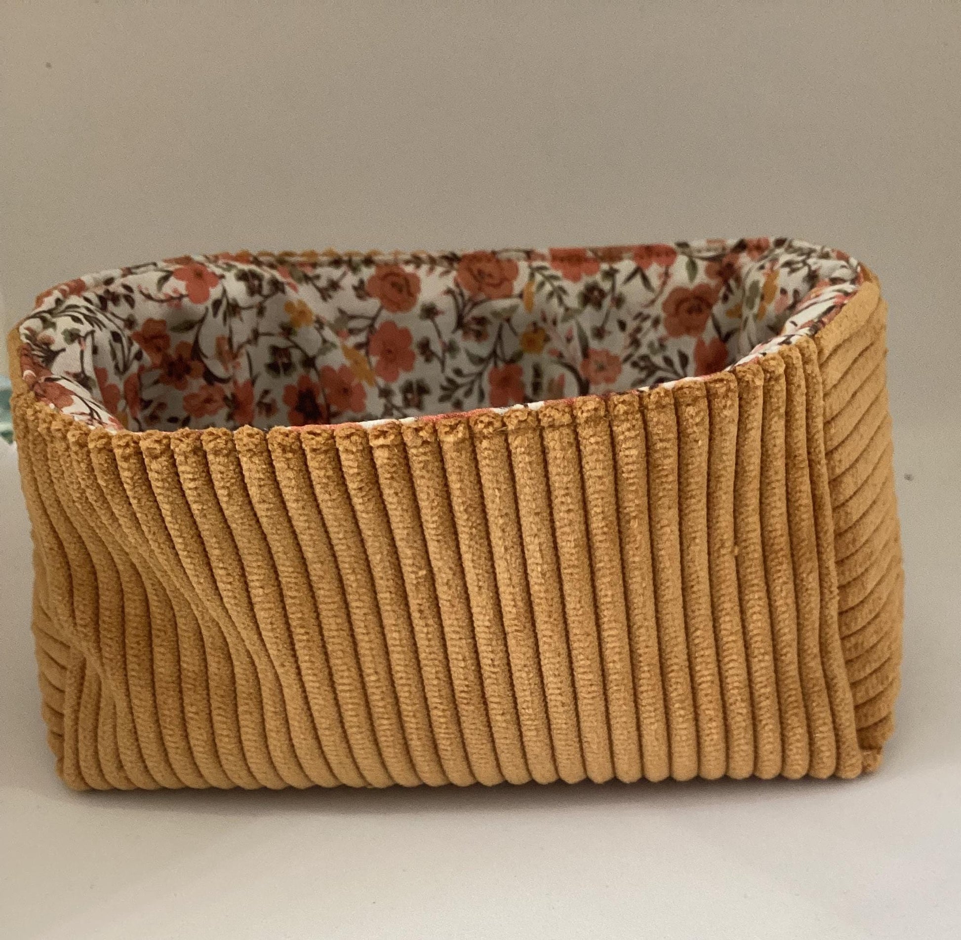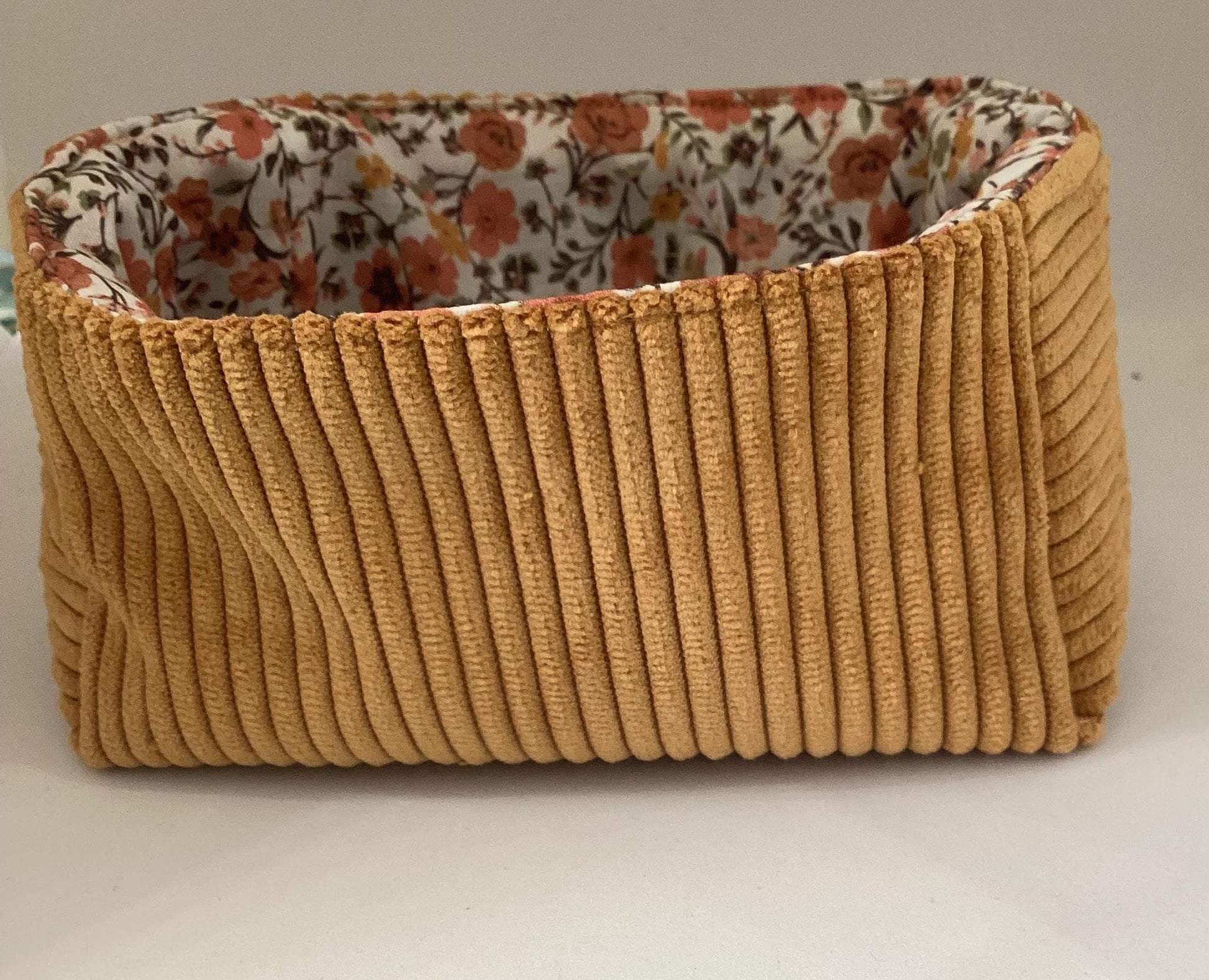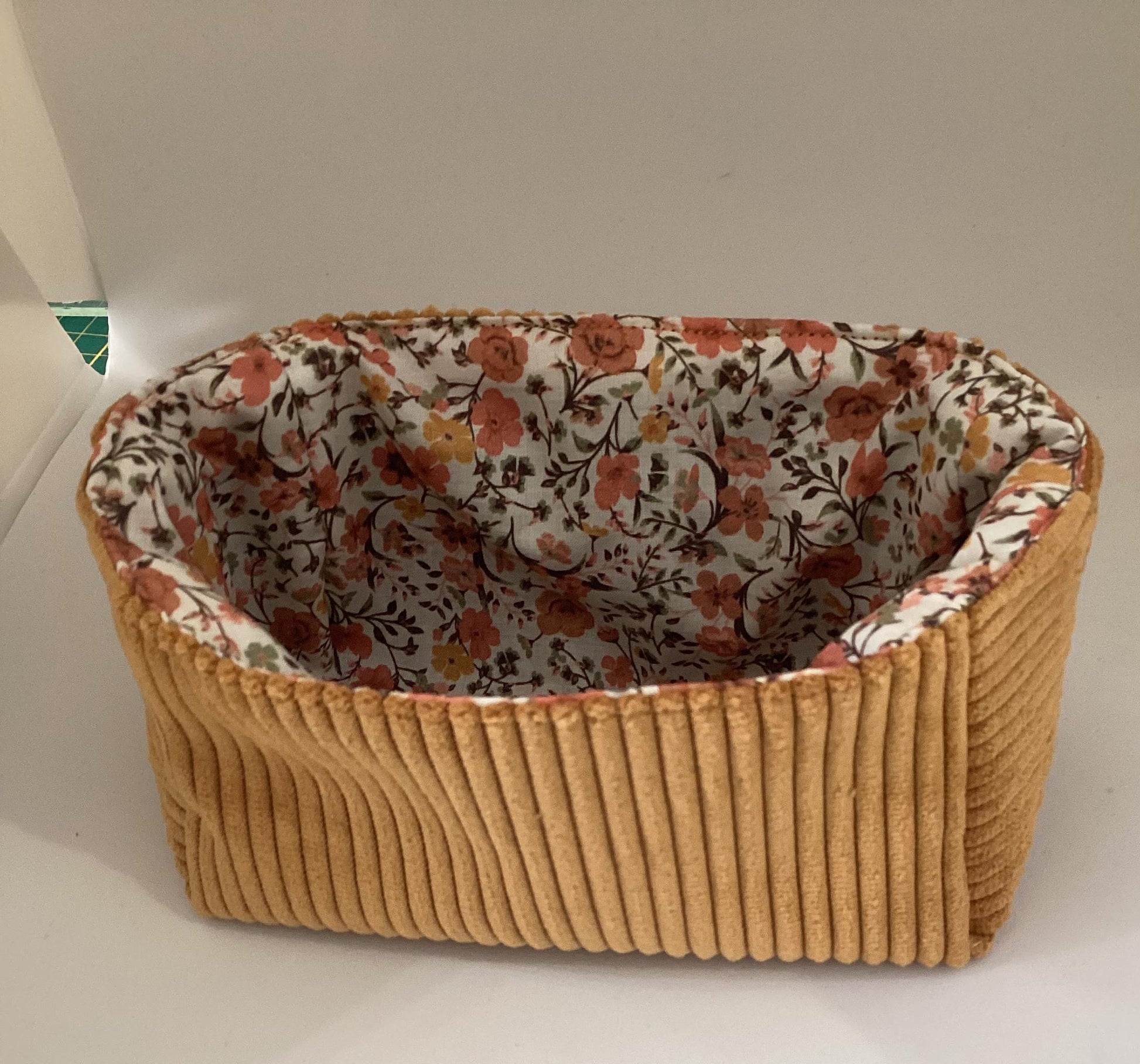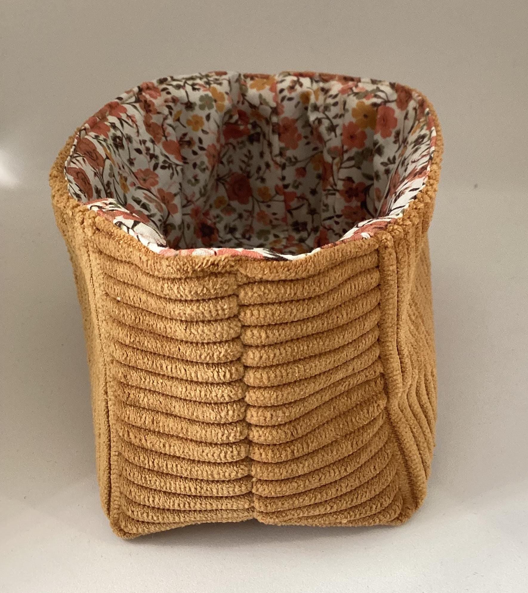 Ce vide poche est réalisé en velours côtelé camel et tissu fleuri à l'intérieur.