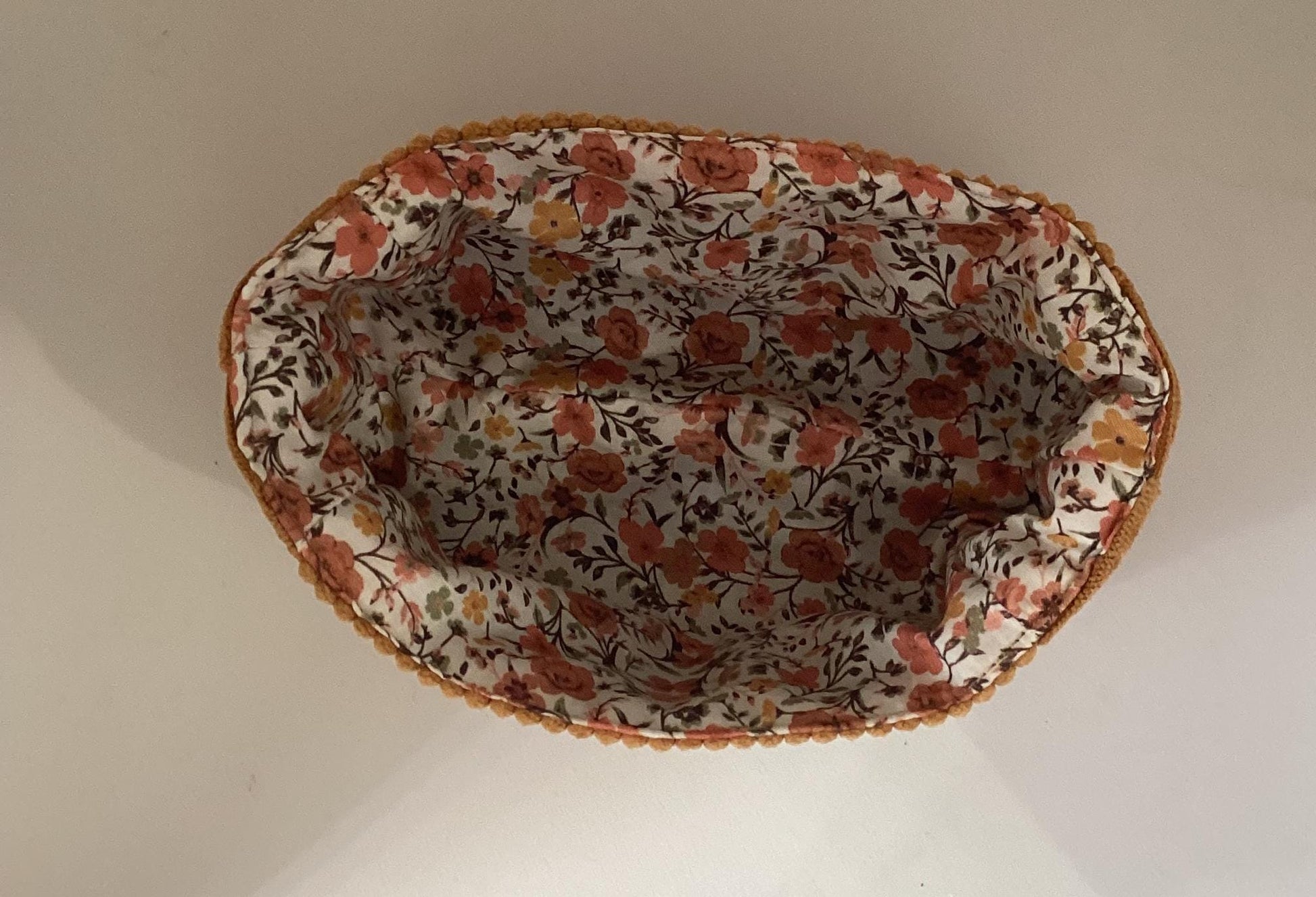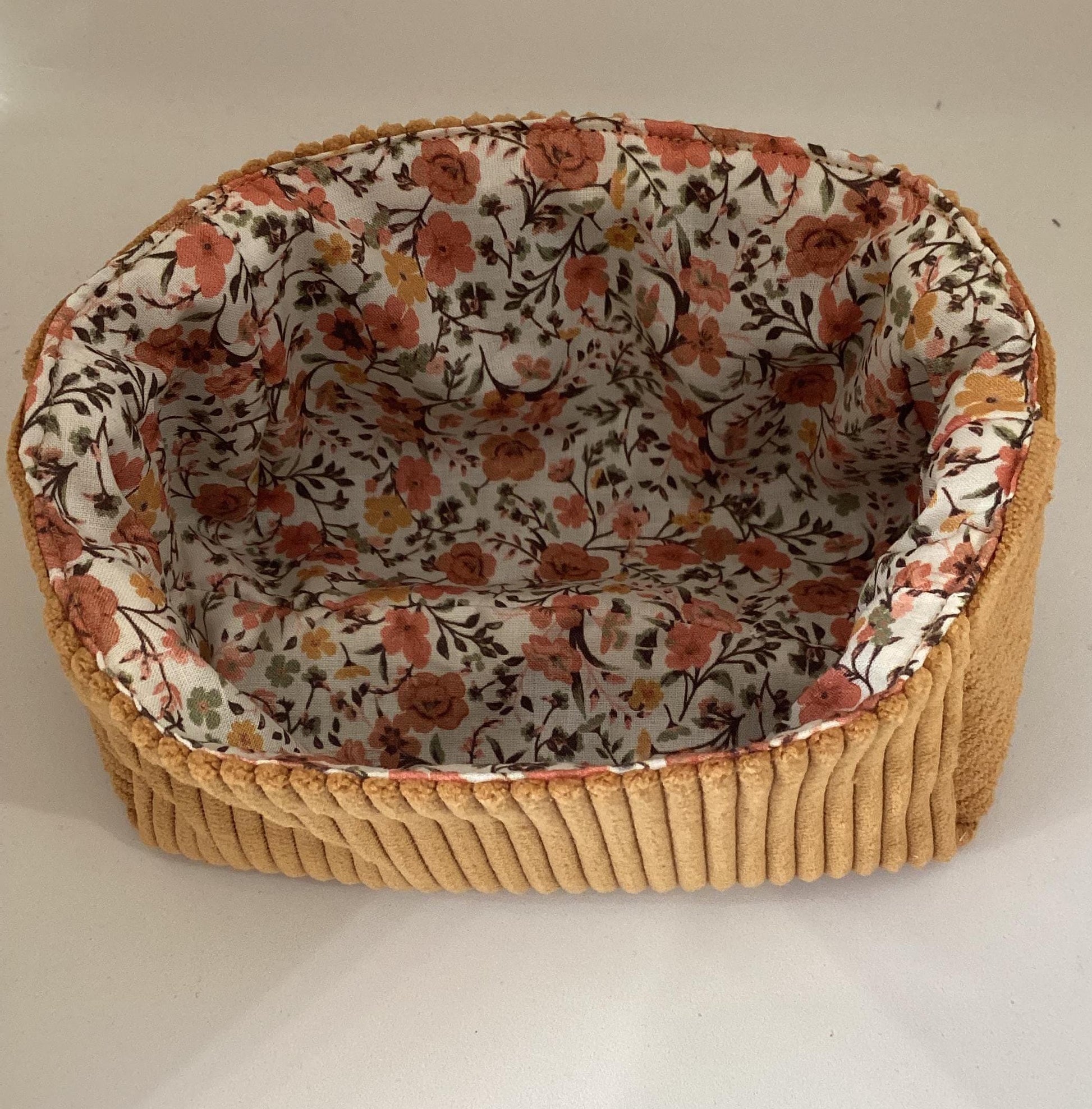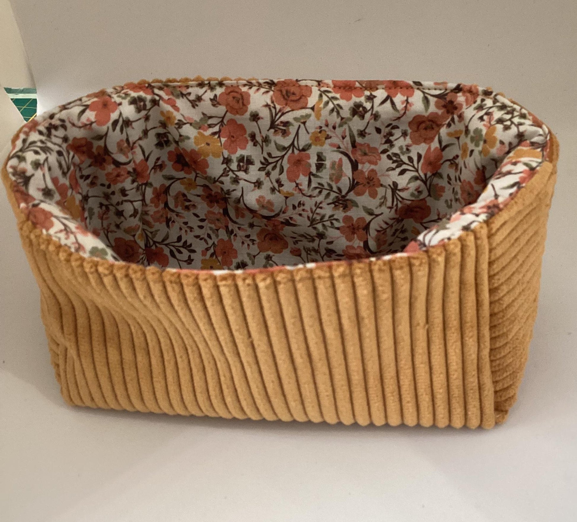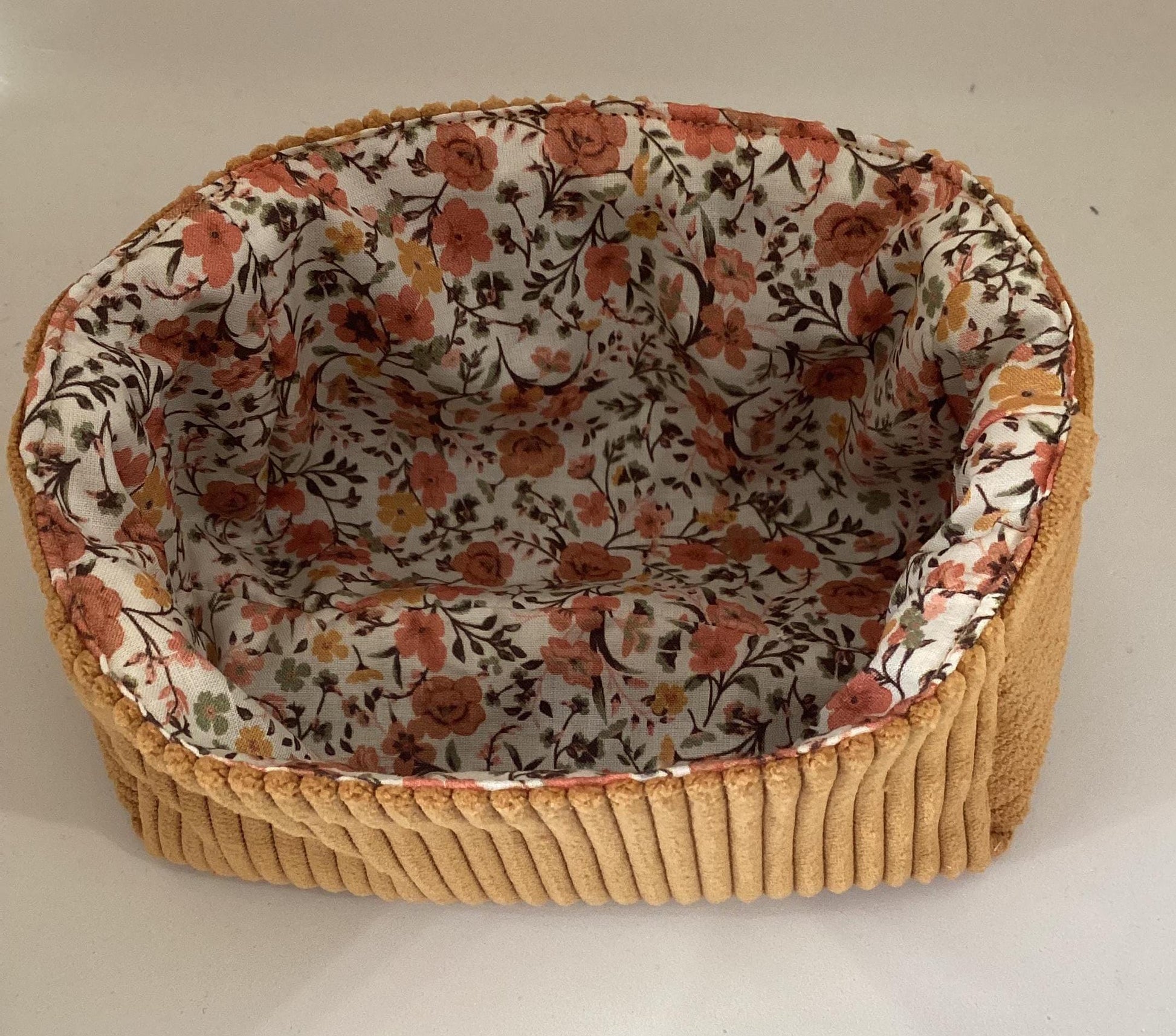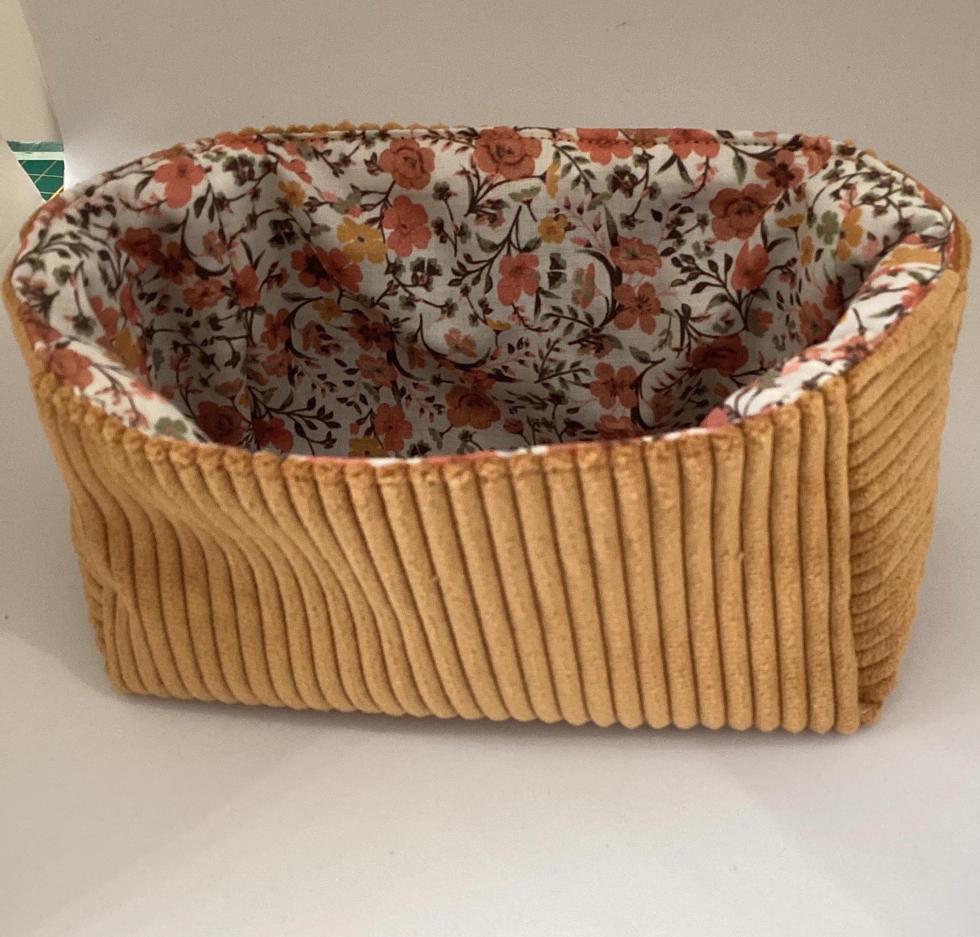 Ce vide poche est réalisé en velours côtelé camel et tissu fleuri à l'intérieur.